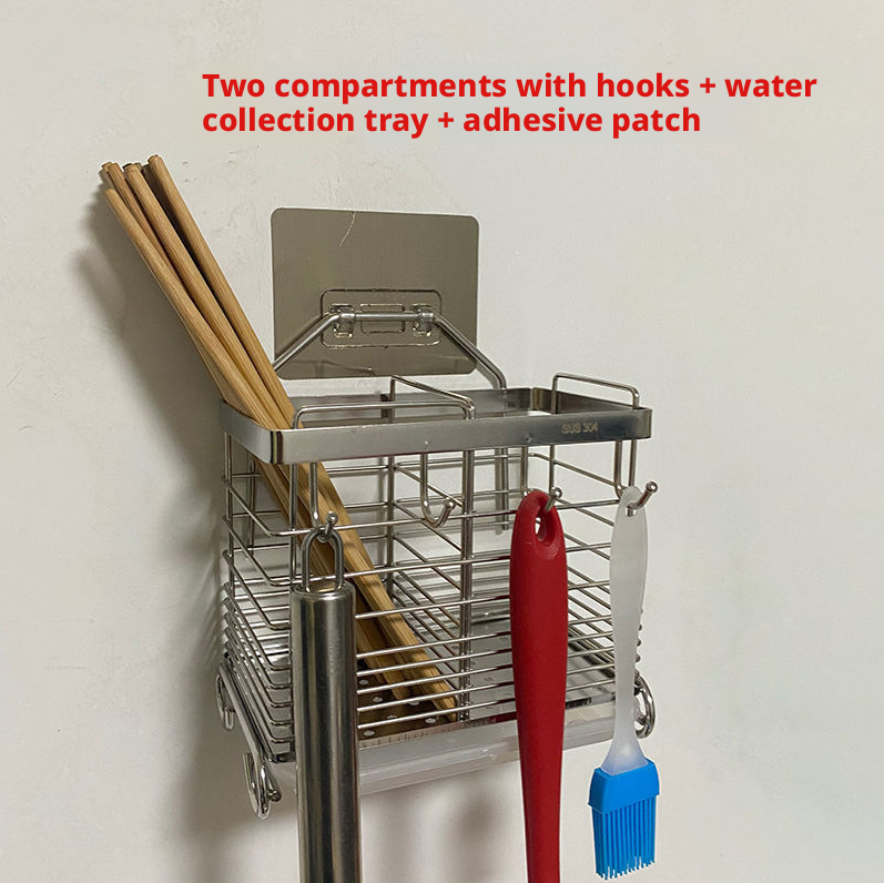 Wall-mounted draining chopstick barrel-two compartments with hook-including patch-304 stainless steel-1 piece