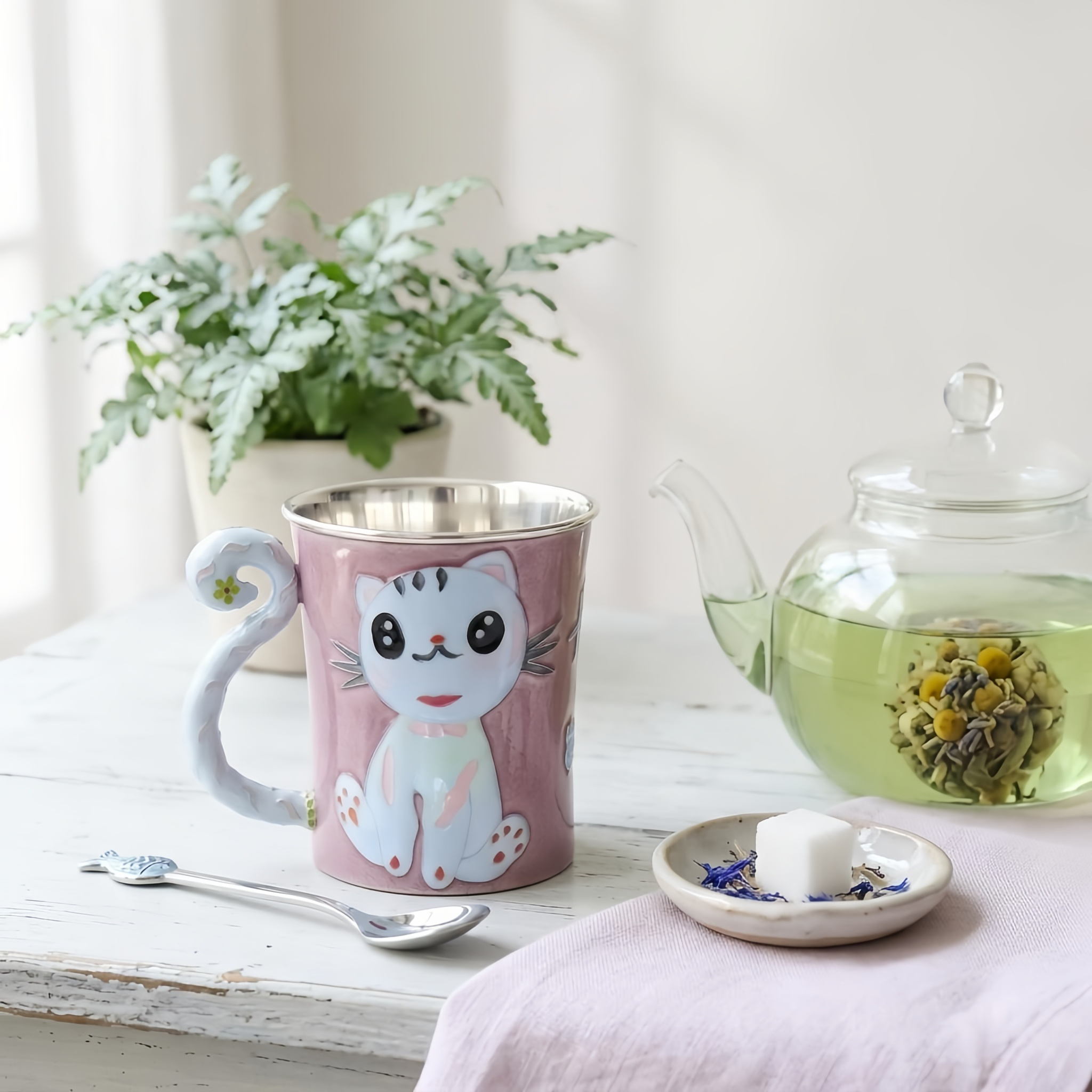 925 Sterling Silver Handcrafted Purple Enamel Cat Mug with Curly Tail Handle and Fine Silver Trim - Handicraft