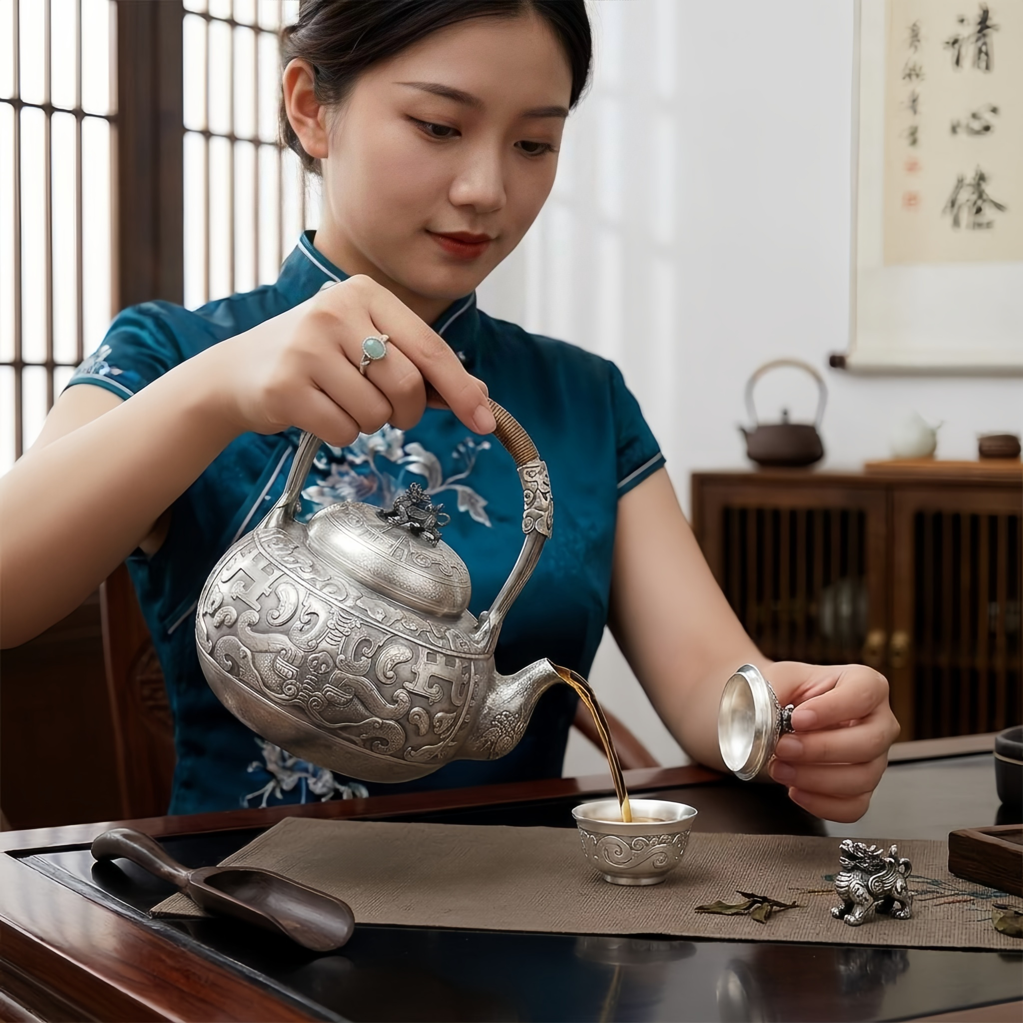 925 Sterling Silver Antique Hand-Carved Silver Teapot with Mythological Beast Finial and Intricate Dragon Relief - Handicraft