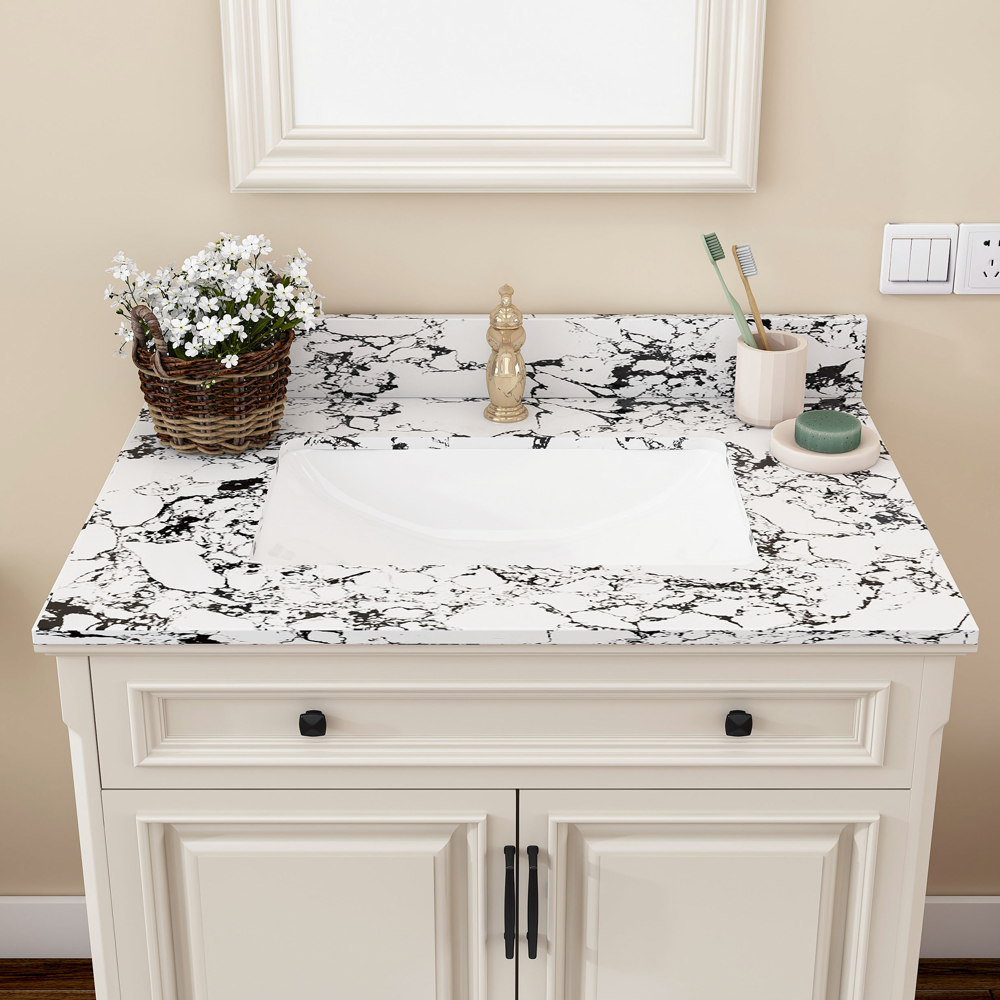 31x22 Bathroom Vanity Top, With Undermount Ceramic Sink And Backsplash, Artificial Marble Bathroom Vanity Top With 1 Pre-Drilled Hole, New Carrara White And Black Only Bathroom Vanity Top