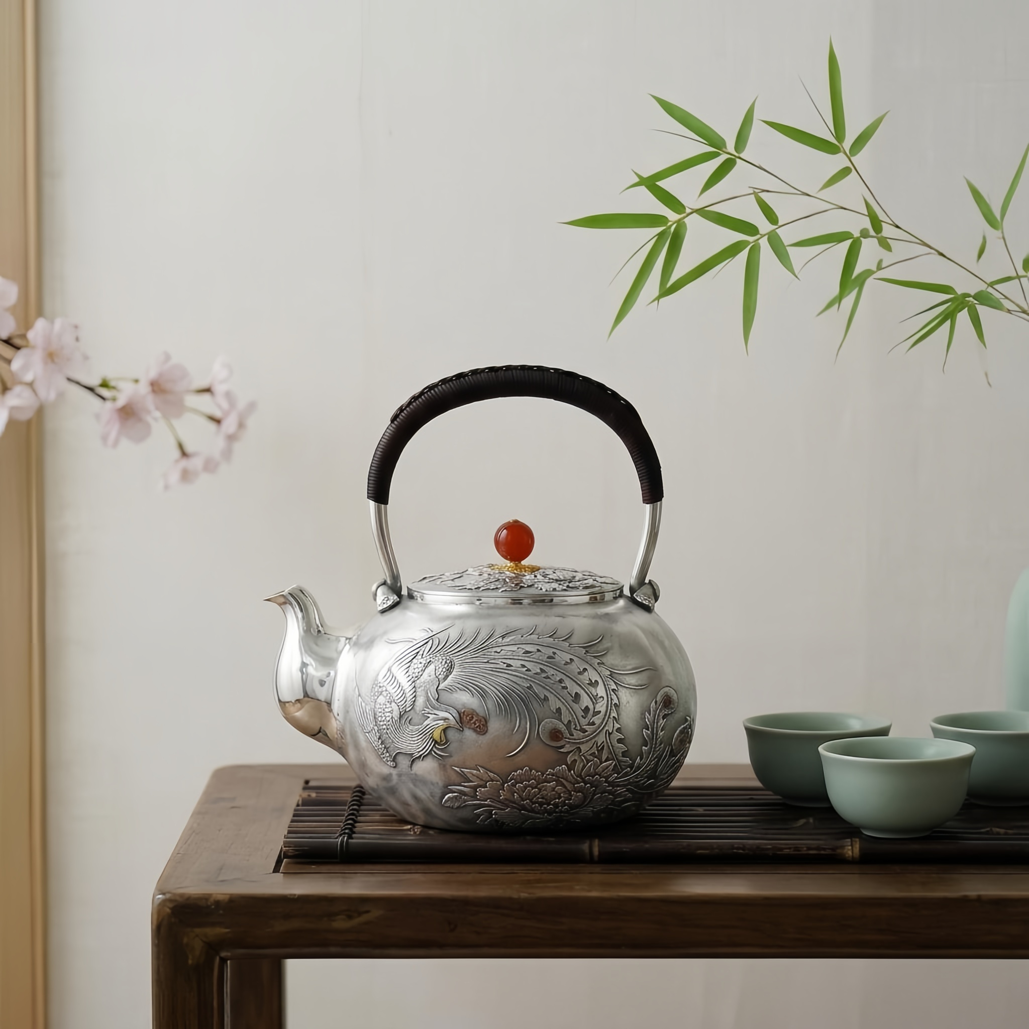 925 Sterling Silver Handcrafted Silver Phoenix and Peony Teapot with Red Bead Finial and Woven Handle - Handicraft