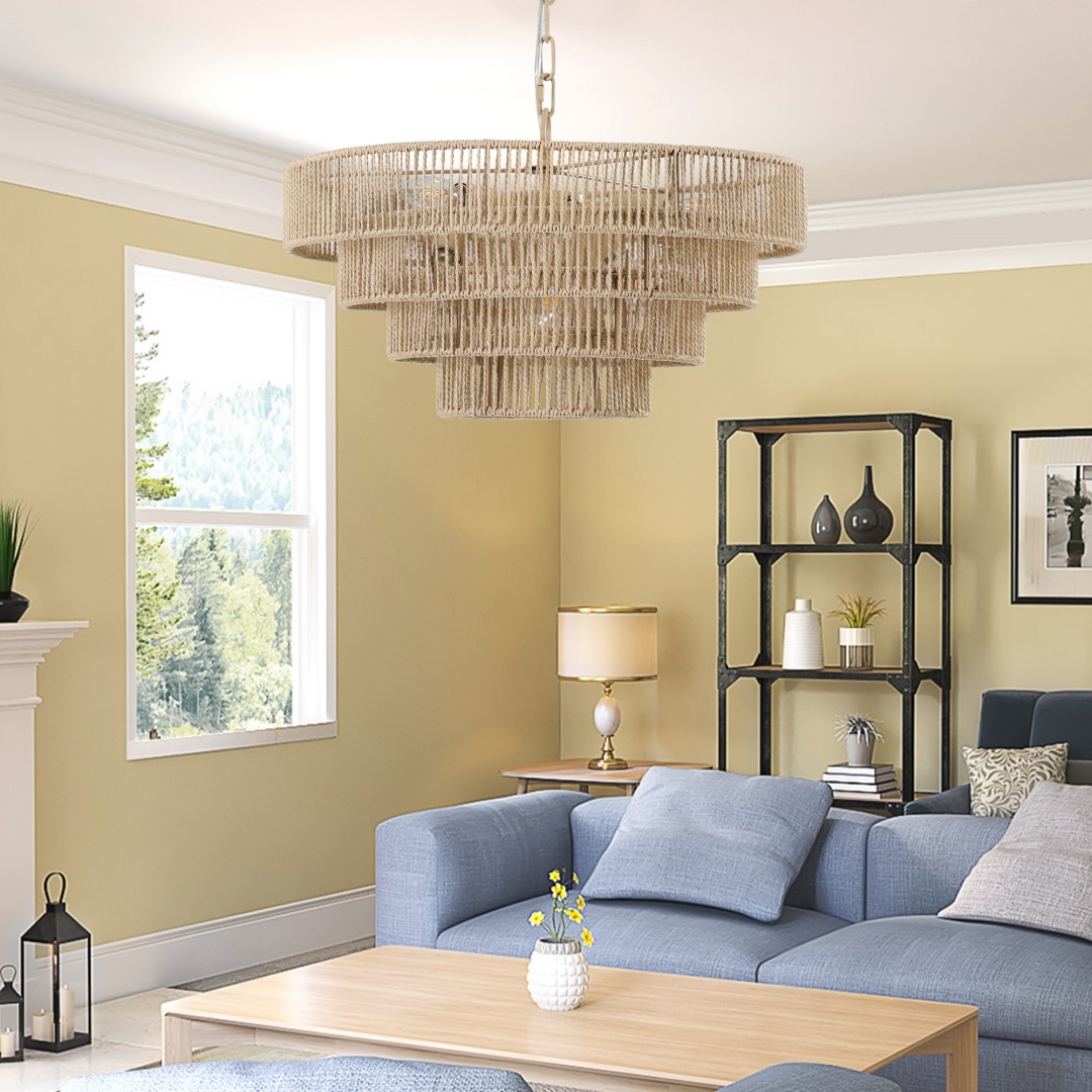 Same As W1340P155976 -L1019-4 20 Modern 4-Layer Woven Hemp Rope Chandelier, Boho Style Pendant Light, Elegant Hanging Light Fixture For Living Room, Dining Room, Bedroom No Bulbs