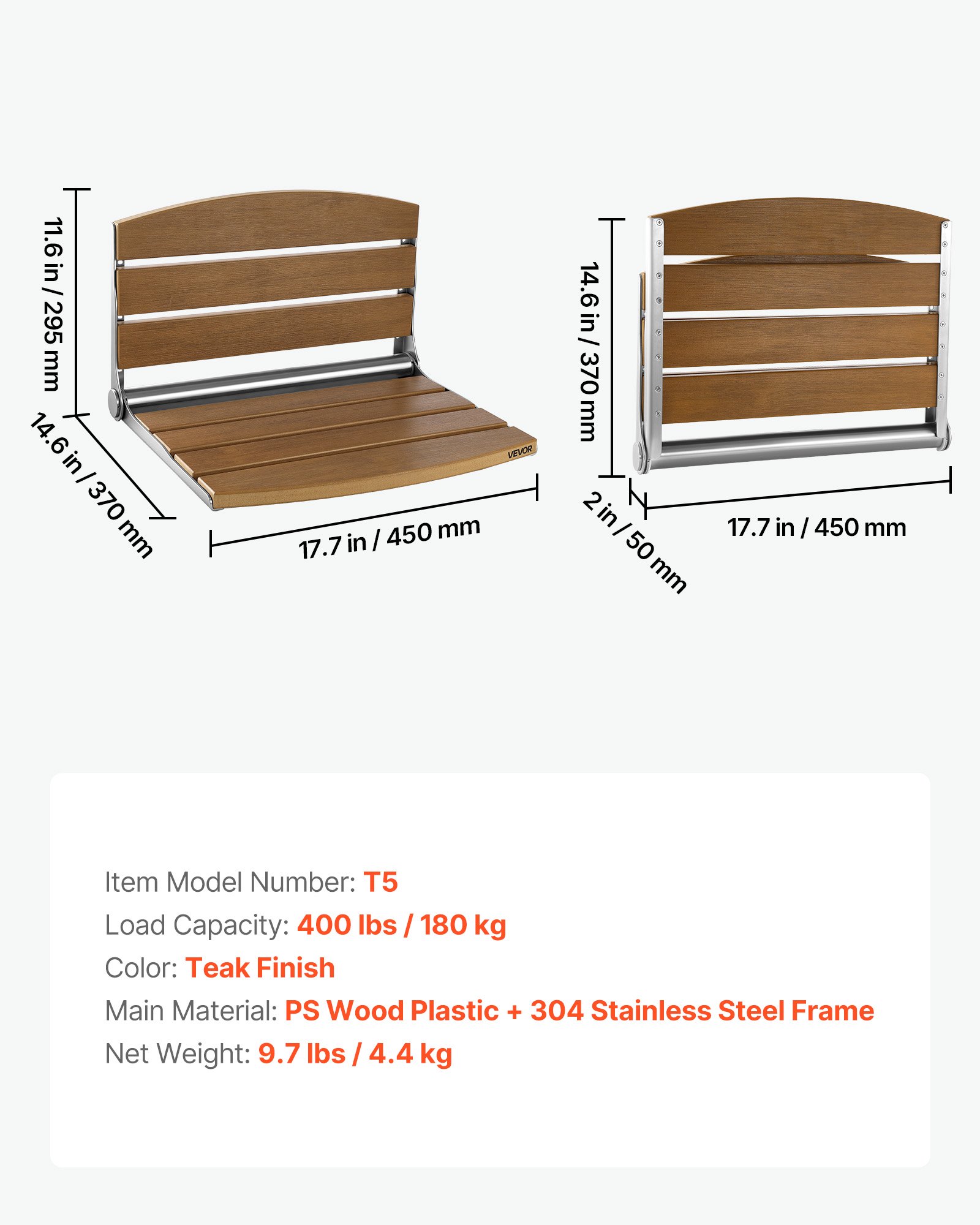 Foldable Shower Seat Wall Mounted, 17.7" Folding Shower Bench With Supportive Backrest, Fold-Down Bathroom Corridor Seat With Stainless Steel Frame For Adults Seniors, 400LBS Loading
