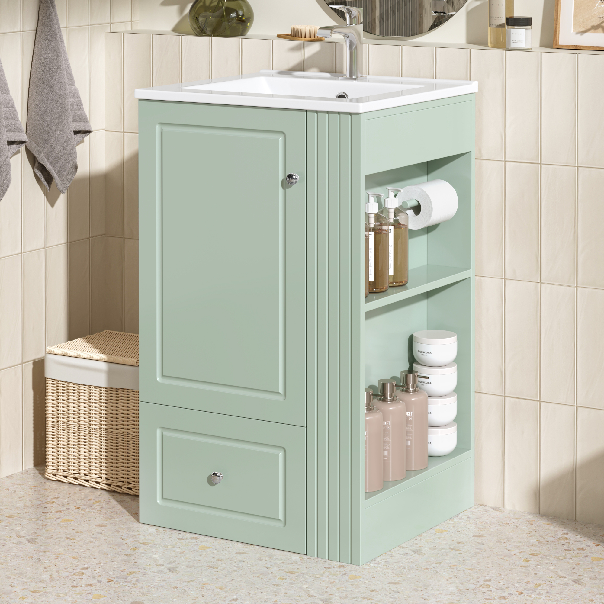 20 Freestanding Bathroom Vanity With Ceramic Sink, Single Faucet Hole, MDF Storage Cabinet With Soft-Close Drawer, Open Side Shelves With Pinewood Towel Bar, Modern Small Bathroom Vanity For Compact