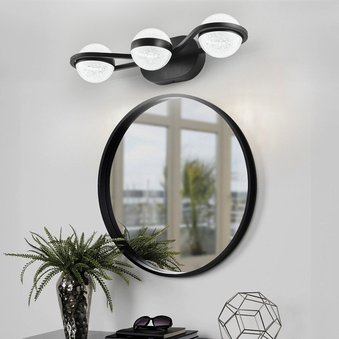 Bathroom Vanity Light, LED 3 Bulb Crystal Sand Acrylic Shades, Wall Mounted Decorative Lighting Fixture, Suitable For Bathroom Vanity Mirror Black