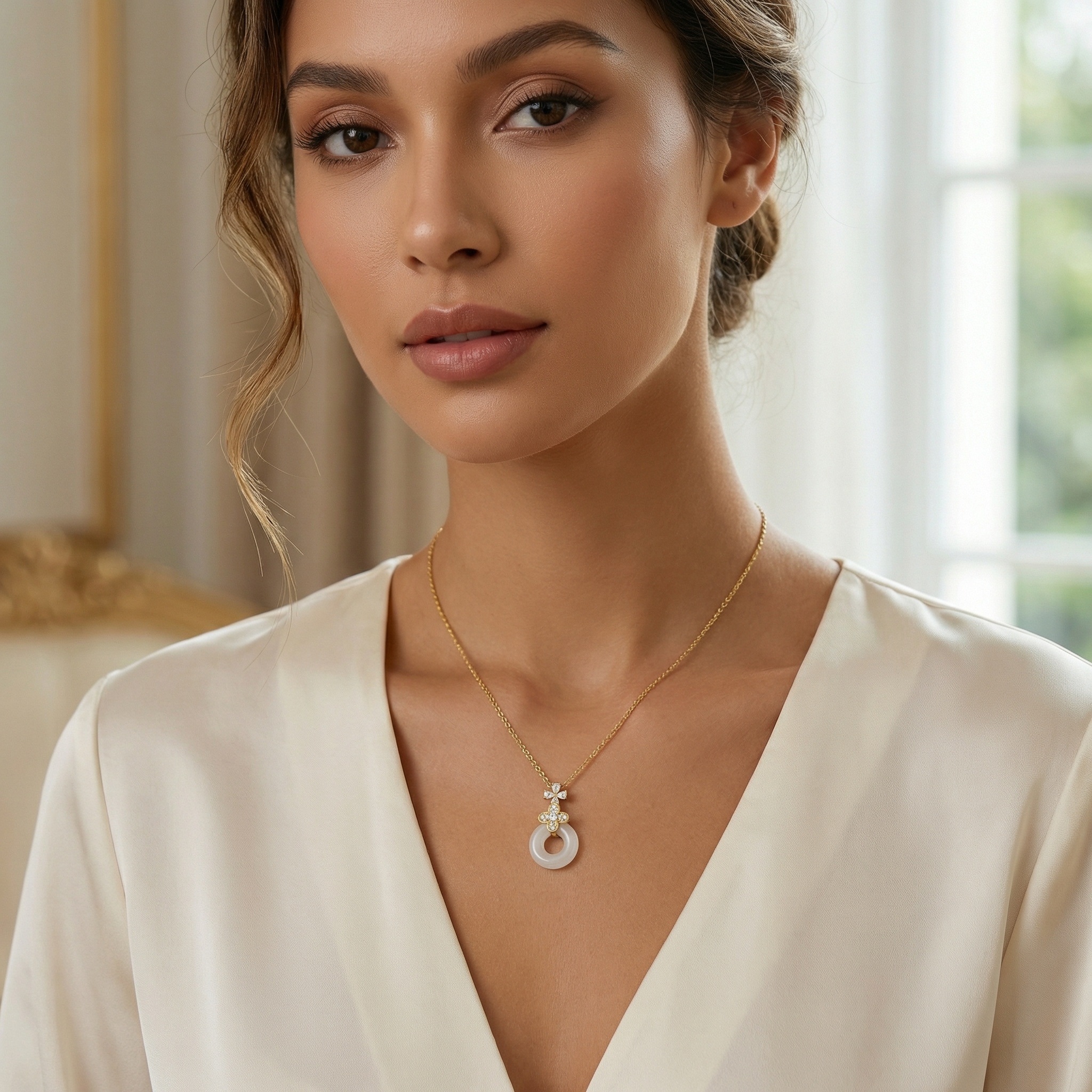925 Sterling Silver Elegant White Jade Donut Pendant with Sparkling Floral Accents and Delicate Chain