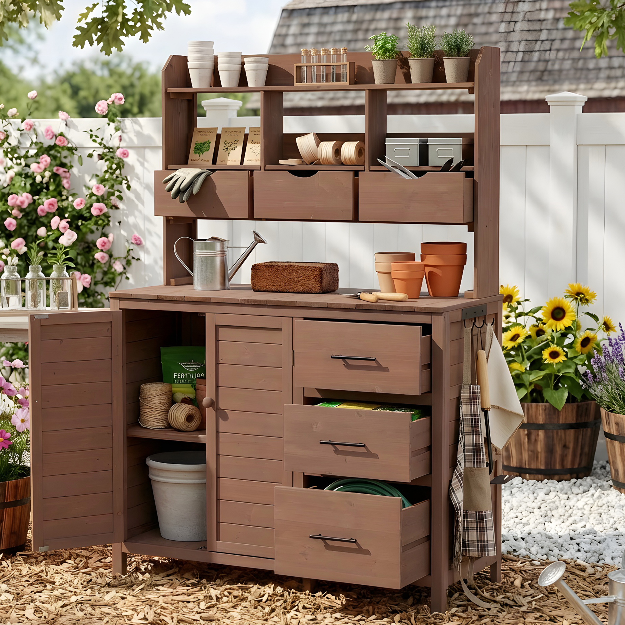 With Assembly Video TOPMAx Farmhouse Patio Potting Bench 44.6 X19.5 Large Freestanding Garden Workstation With 6 Drawers Bottom Cabinet And Side Hook Outdoor Kitchen Island Brown
