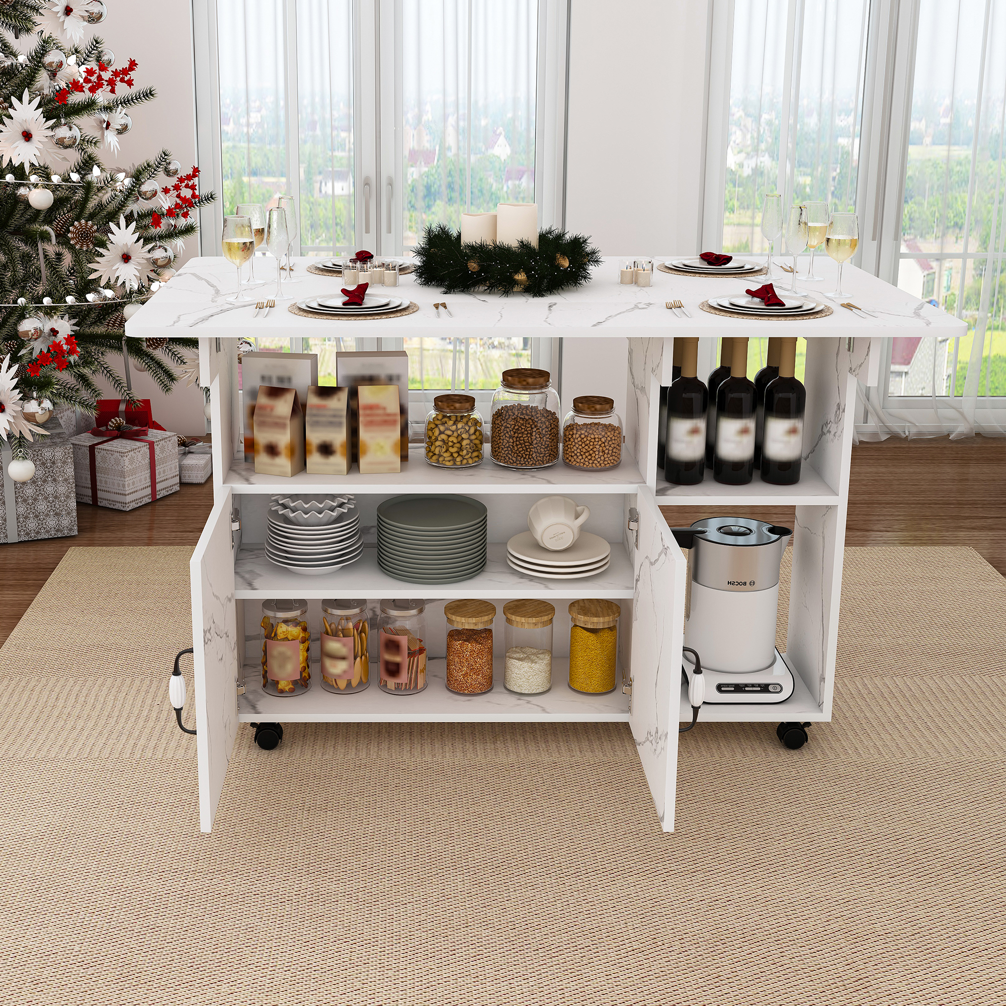 Multi-Functional Folding Table With Storage Shelves And Wheels 47 Inch Foldable Dining Table For Small Spaces Compact Desk For Kitchen Dorm Office White