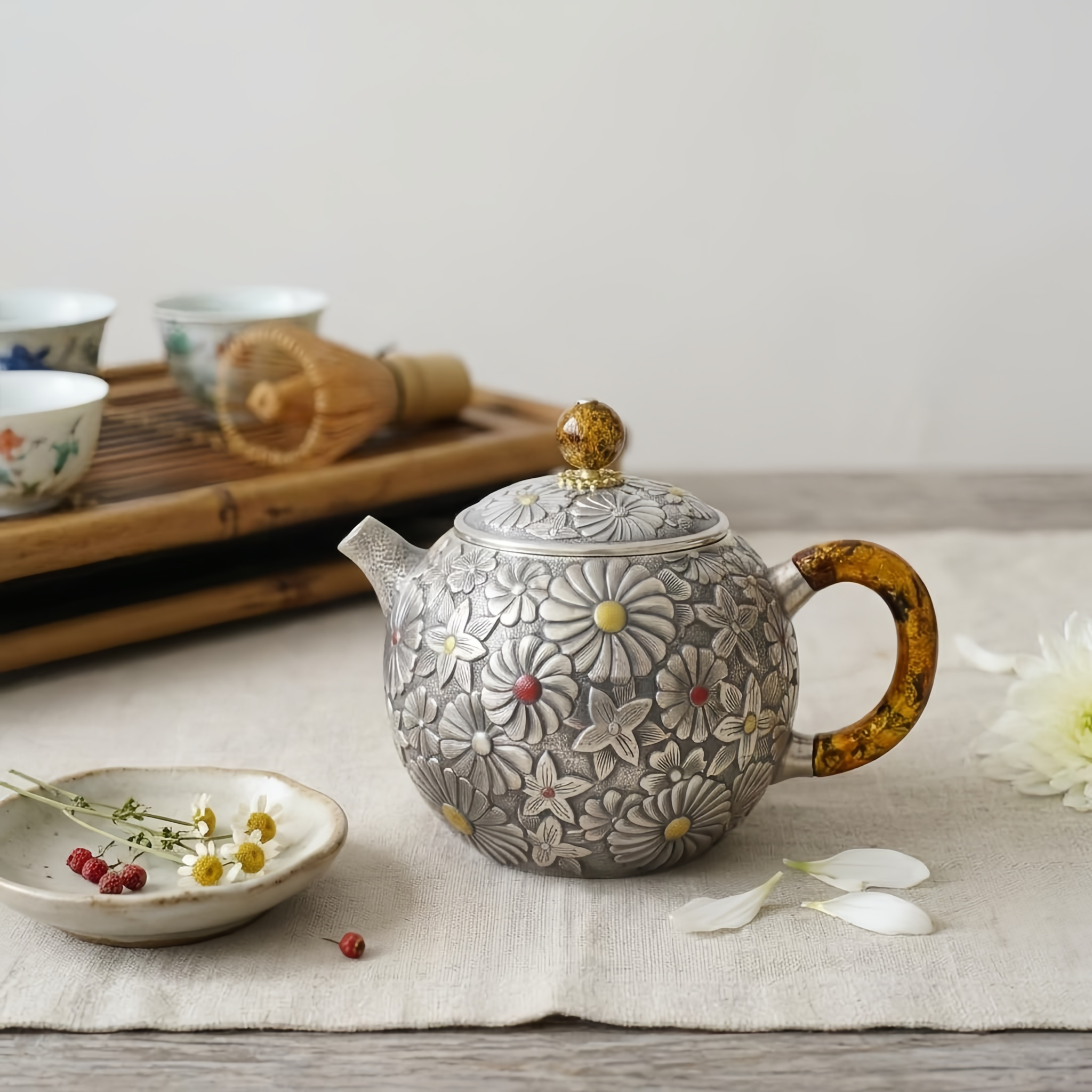 925 Sterling Silver Floral Teapot with Gold Handle and Speckled Lid-exquisite handmade teapot - Handicraft