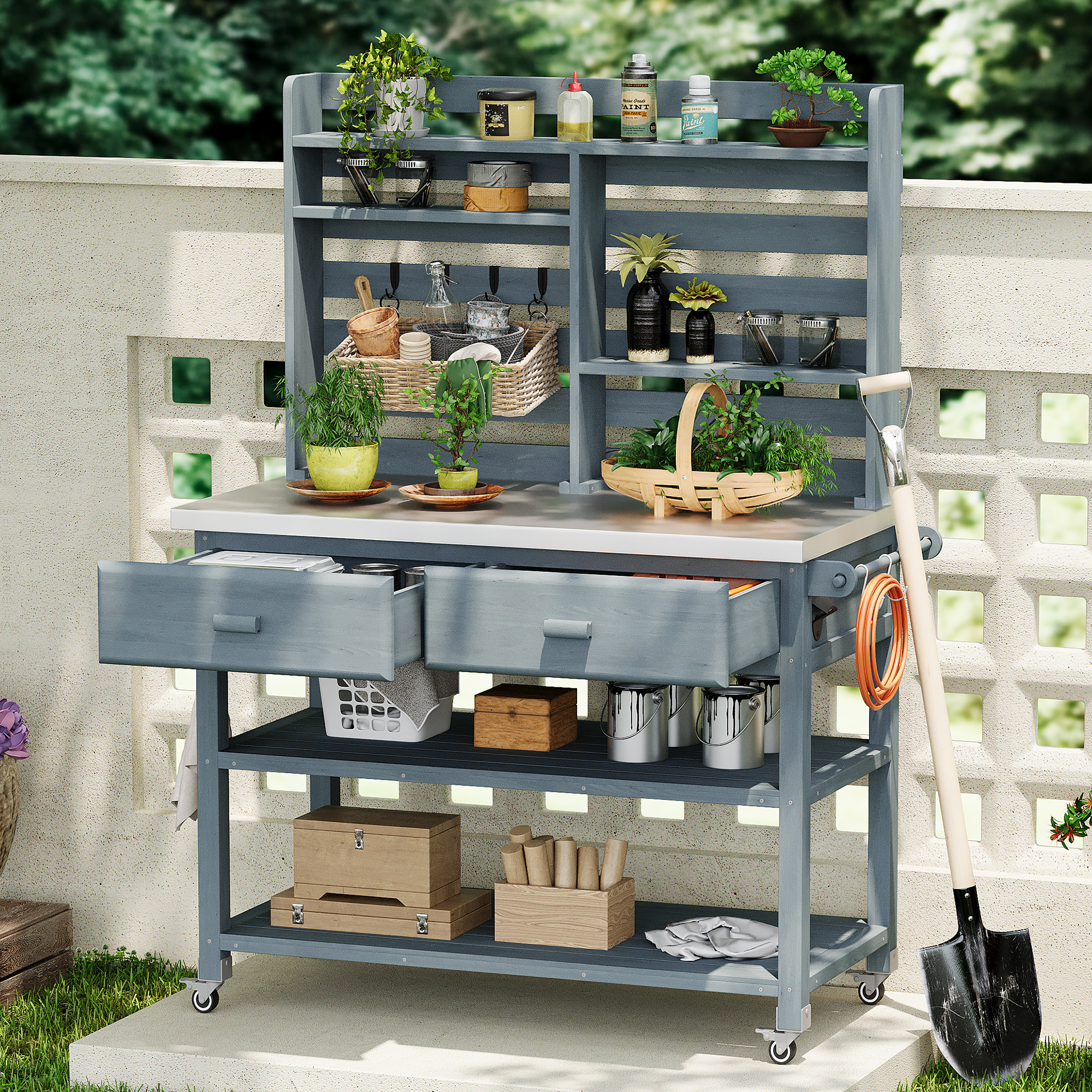 K&K 64.9 H Outdoor Potting Bench Table With Lockable Wheels, Solid Wood Outdoor Kitchen Island With Upper Hutch, Stainless Steel Top, Towel Rack ,Outdoor Storage For Grilling, Lawn Garden Grey Blue