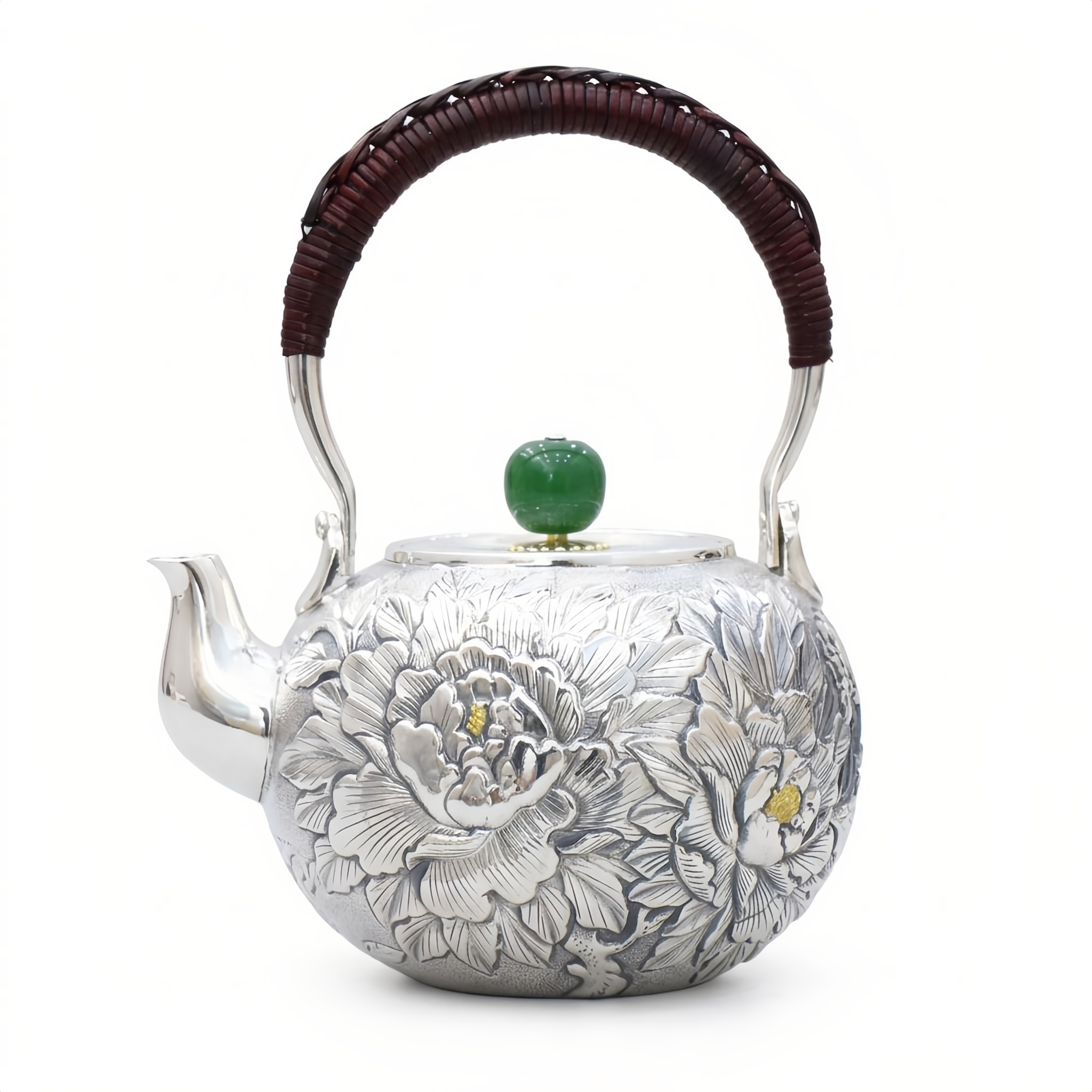 925 Sterling Silver Hand-Carved Silver Peony Teapot with Woven Handle and Green Jade Finial - Handicraft