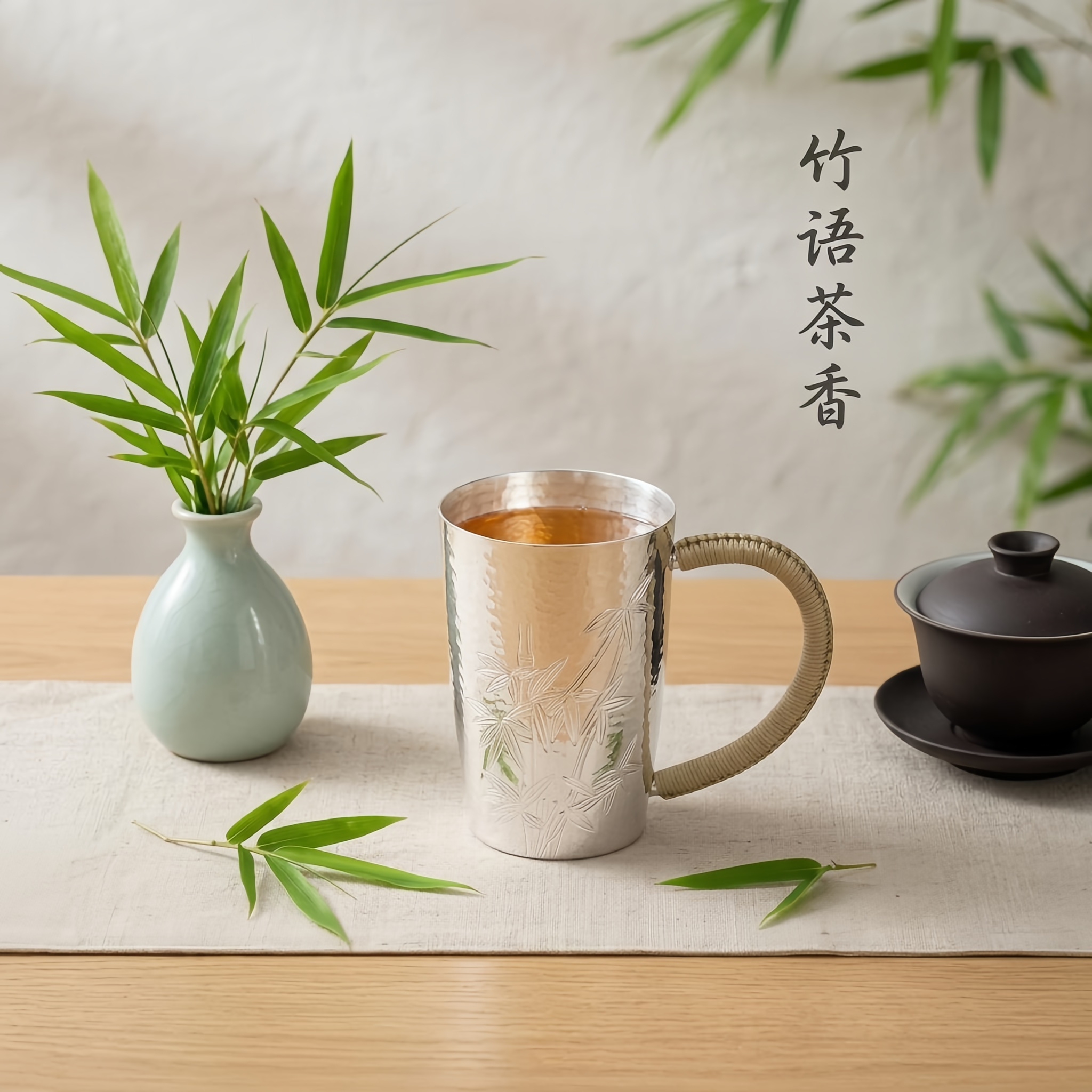 925 Sterling Silver Elegant Hand-Hammered Silver Cup with Bamboo Engravings and Woven Handle - Handicraft