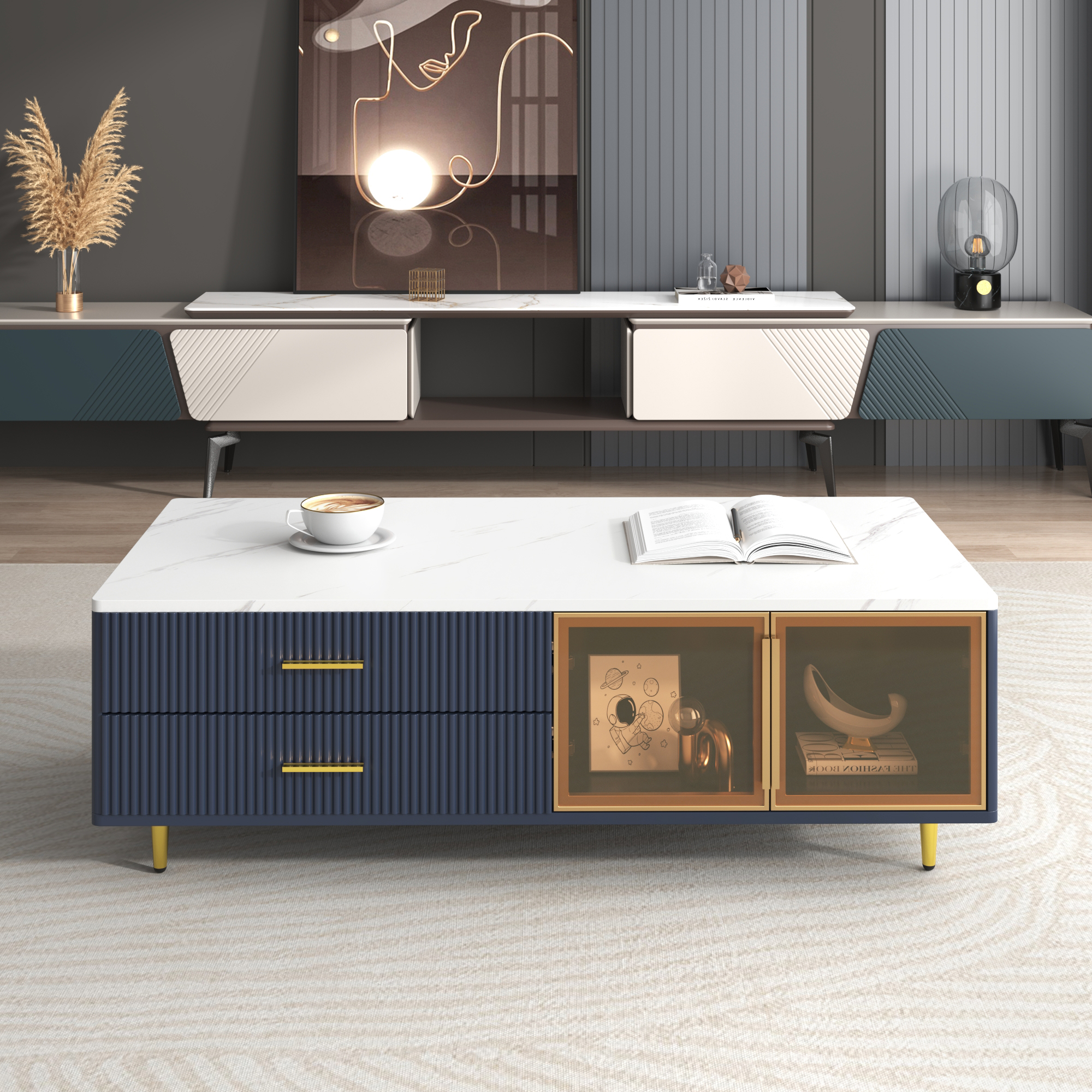 Modern Navy Blue Coffee Table With 2 Glass Door Storage, 4 Drawers, Gold Metal Legs, And Multi-Color Lighting In 47.2