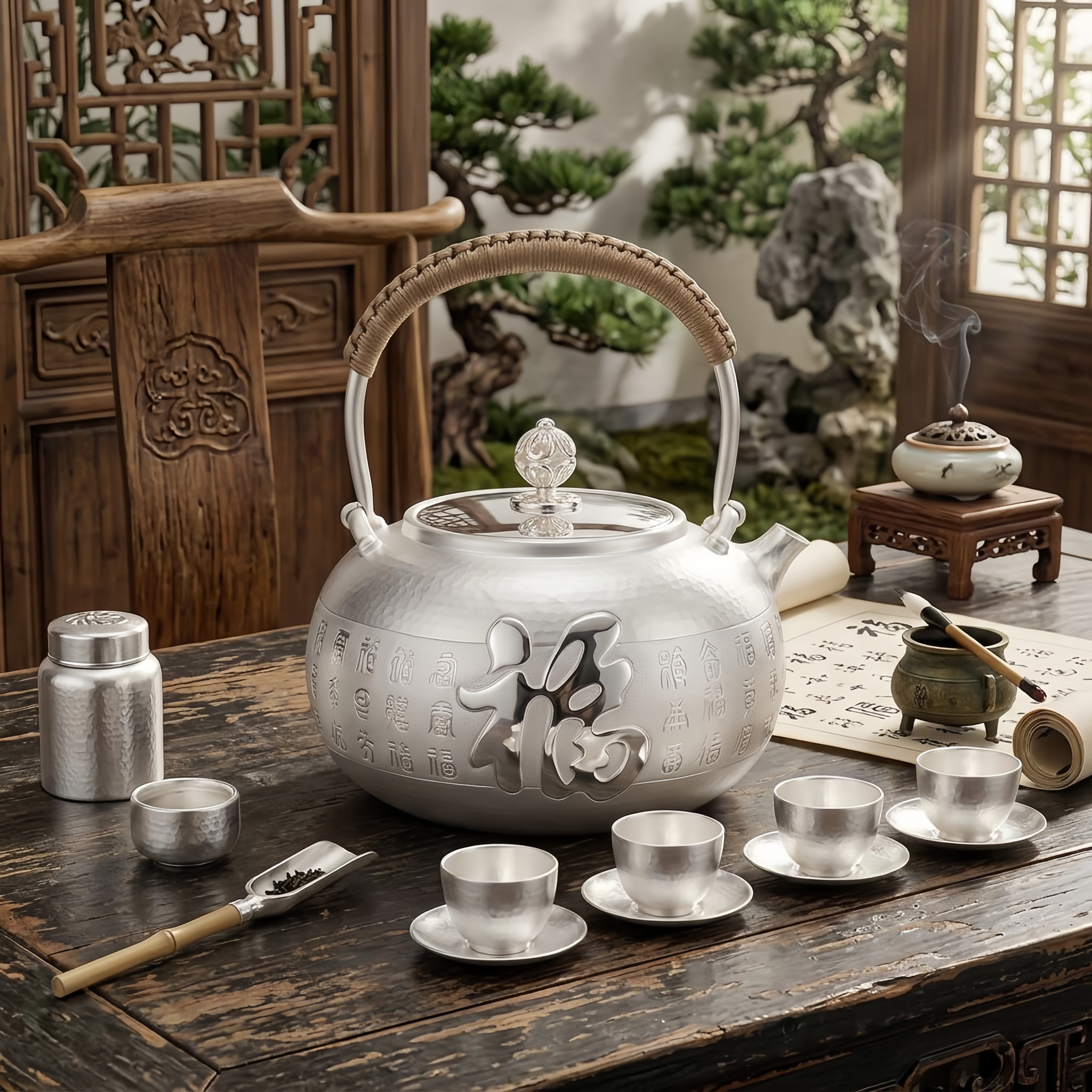 925 Sterling Silver Traditional Hand-Hammered Silver Teapot Featuring Prosperity "Fu" Characters and Woven Handle - Handicraft