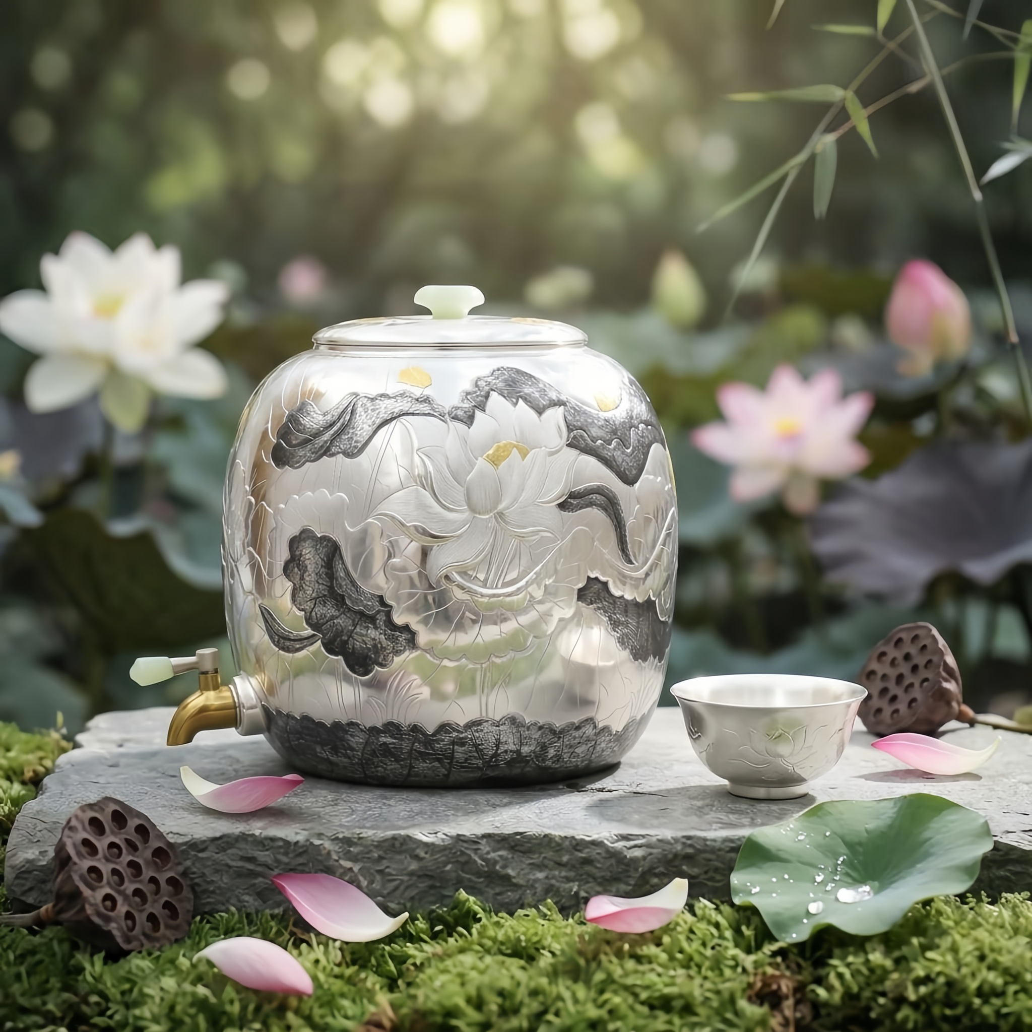 925 Sterling Silver Elegant Silver Lotus Flower Beverage Jar with Exquisite Hand-Engraved Details and Polished Metallic Spigot - Handicraft
