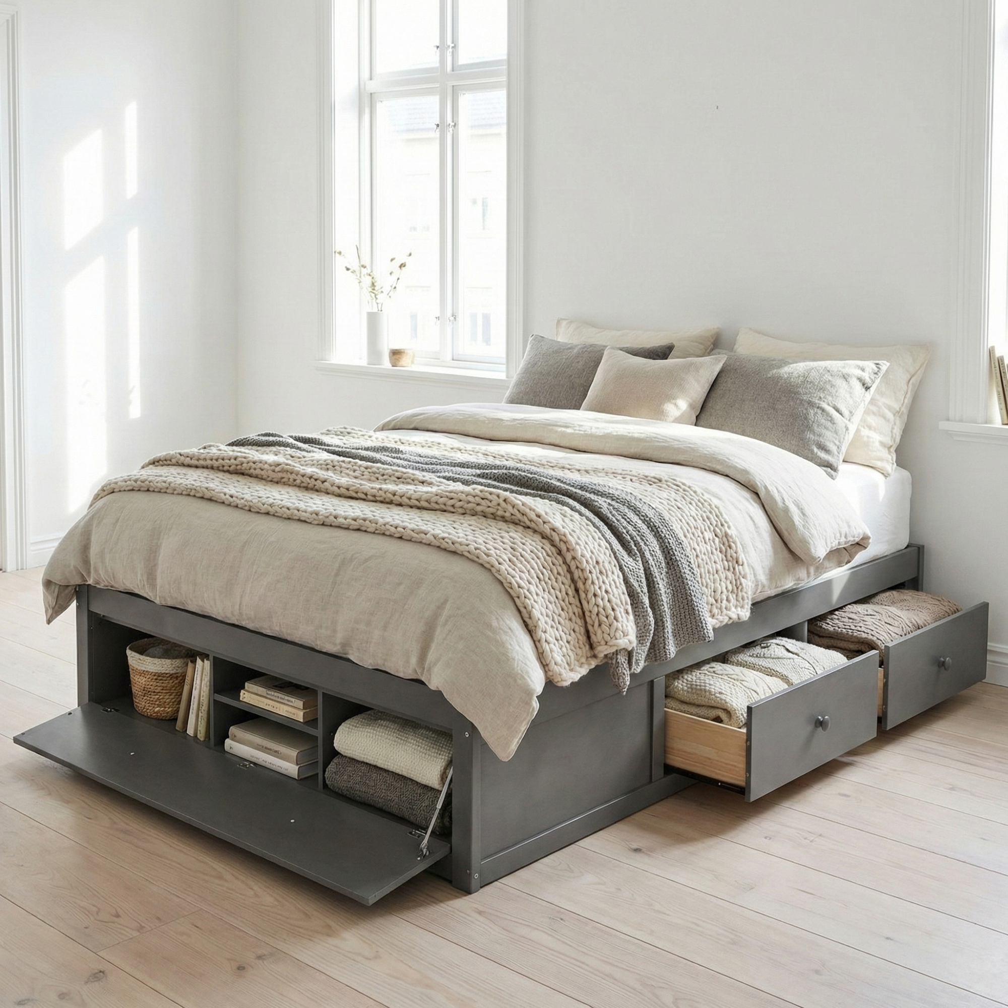 Queen Size Platform Bed Frame With 4 Storage Drawers And Hydraulic Lift Footboard Storage, No Headboard, Modern Space-Saving Design-Antique Gray