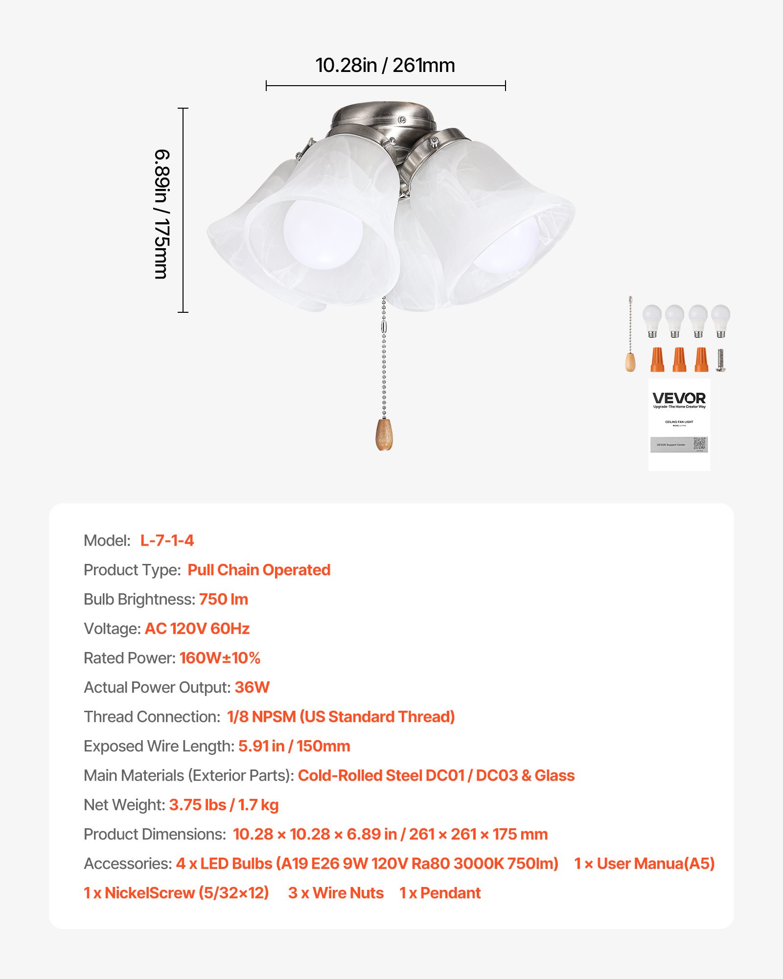 Ceiling Fan Light Kit, Four-Light 3000K 750lm Fan Light Kit With Pull Chain, Replacement Light Fixture For Living Room, Bedroom, Home Decor, Cloud White Glass Shade Brushed Nickel, Floral Shape