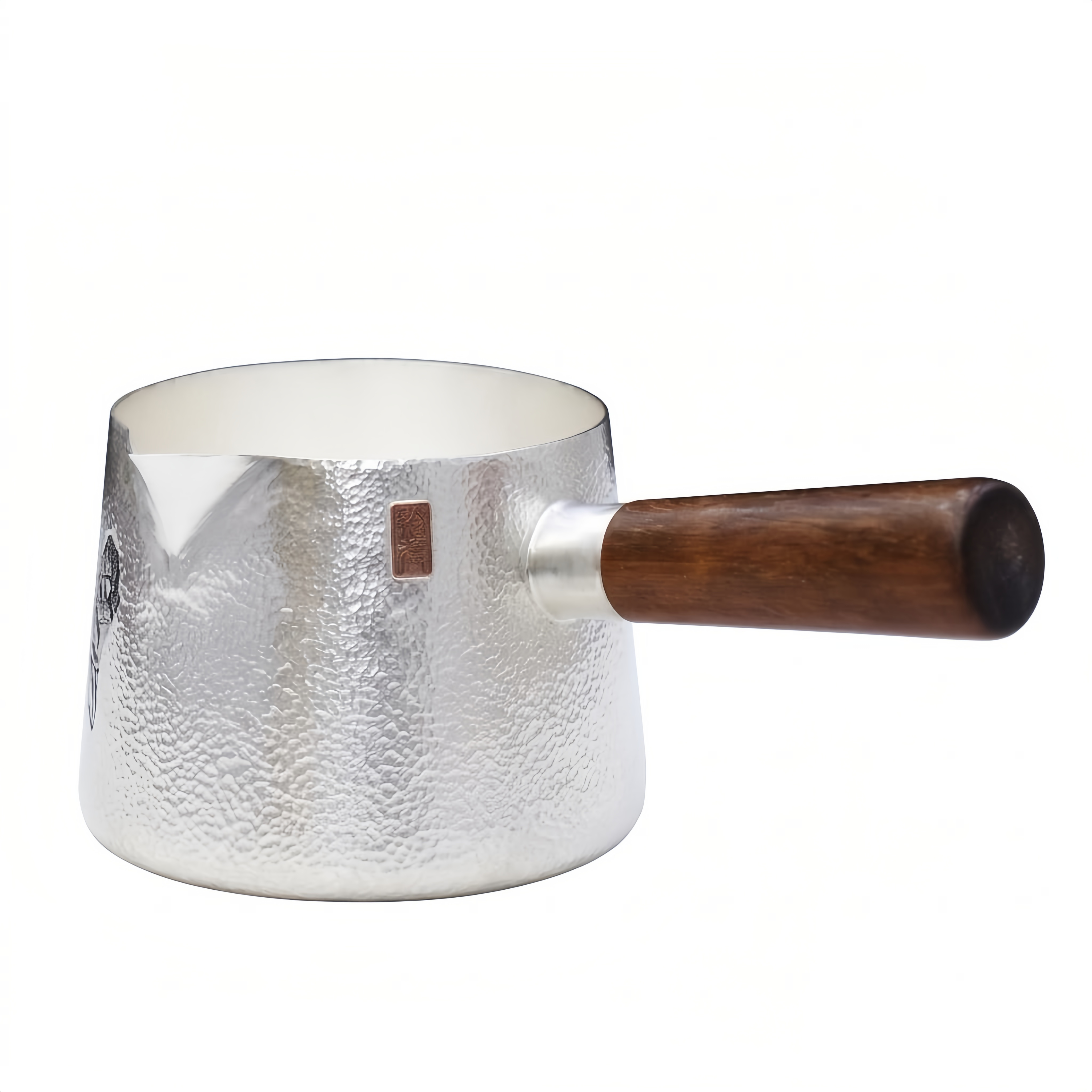 925 Sterling Silver Handcrafted Hammered Metal Pot with Wooden Handle and Copper Plaque-Premium Side-Handle Fair Cup - Handicraft