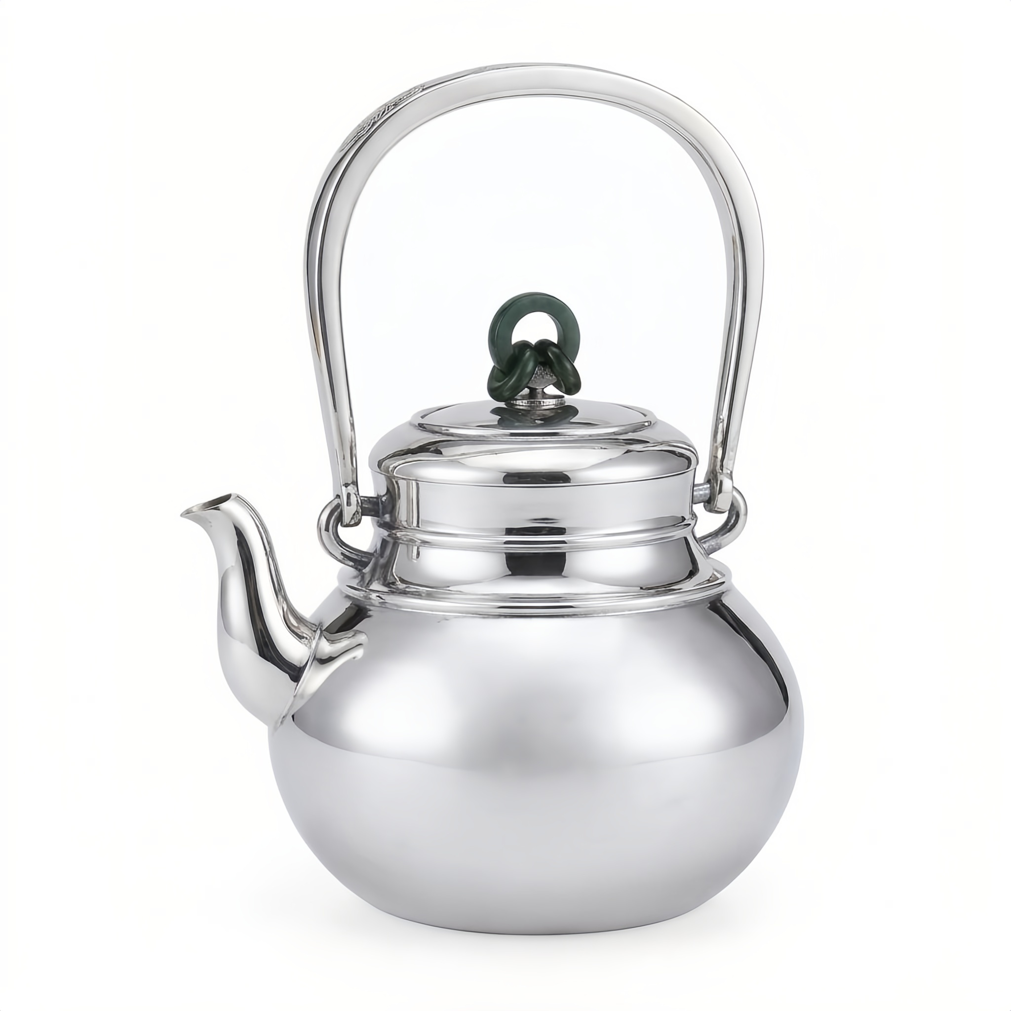 925 Sterling Silver Elegant Polished Silver Tea Kettle with Green Jade Knot Finial and Arch Handle - Handicraft