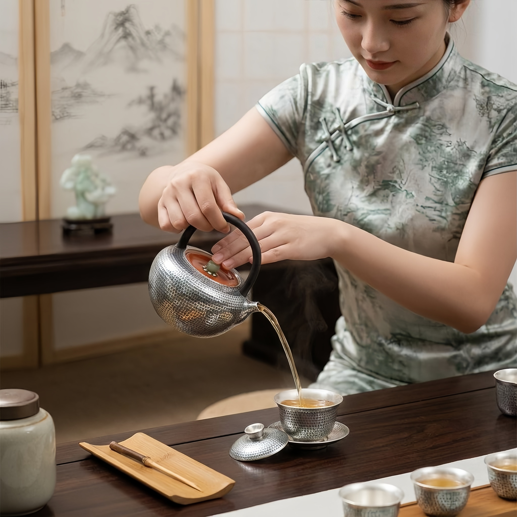 925 Sterling Silver Handcrafted Hammered Silver Teapot Featuring a Jade Finial and Arched Handle - Handicraft