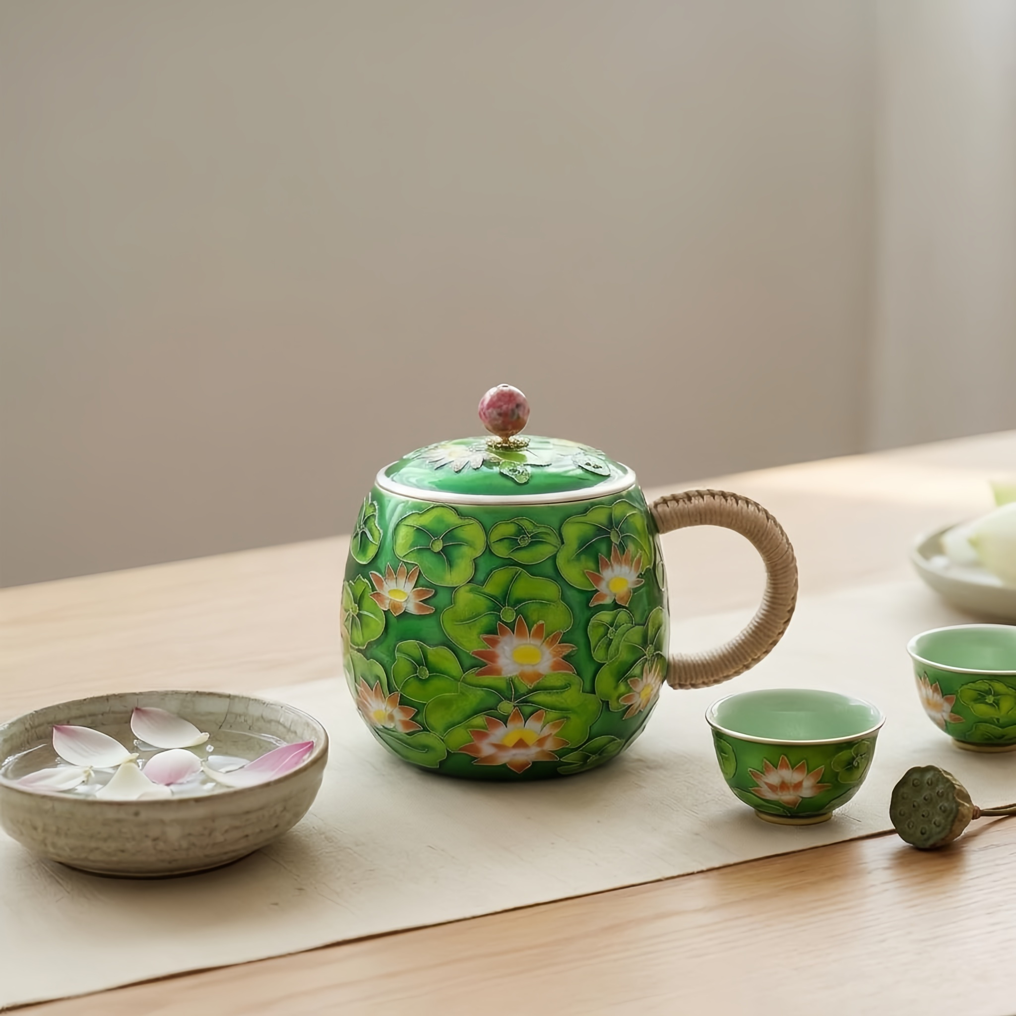 925 Sterling Silver Artistic Lotus Blossom Cloisonné Mug with Natural Woven Handle and Decorative Lid - Handicraft