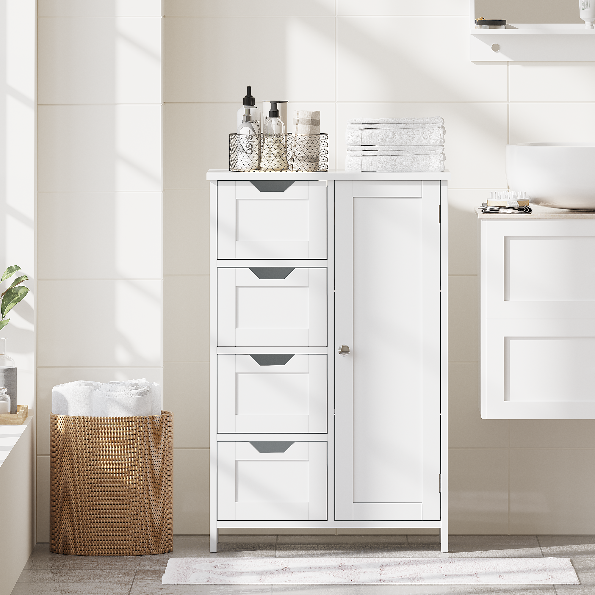 Bathroom Storage Cabinet With 4 Drawers And 1 Door, Freestanding Wooden Floor Organizer For Bathroom, Narrow Storage Cabinet For Small Spaces, Entryway, Living Room Or Hallway, White