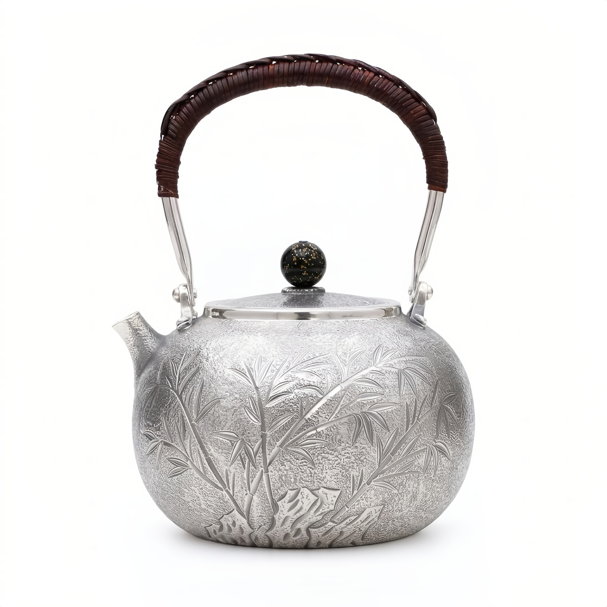925 Sterling Silver Elegant Silver Teapot Featuring Hand-Carved Bamboo Design and Traditional Rattan-Wrapped Handle - Handicraft