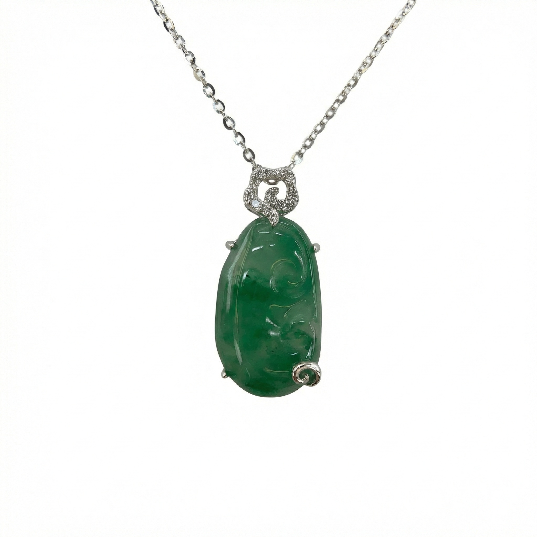 925 Sterling Silver Elegant Translucent Green Jade Pendant Necklace with Ornate Silver Bail
