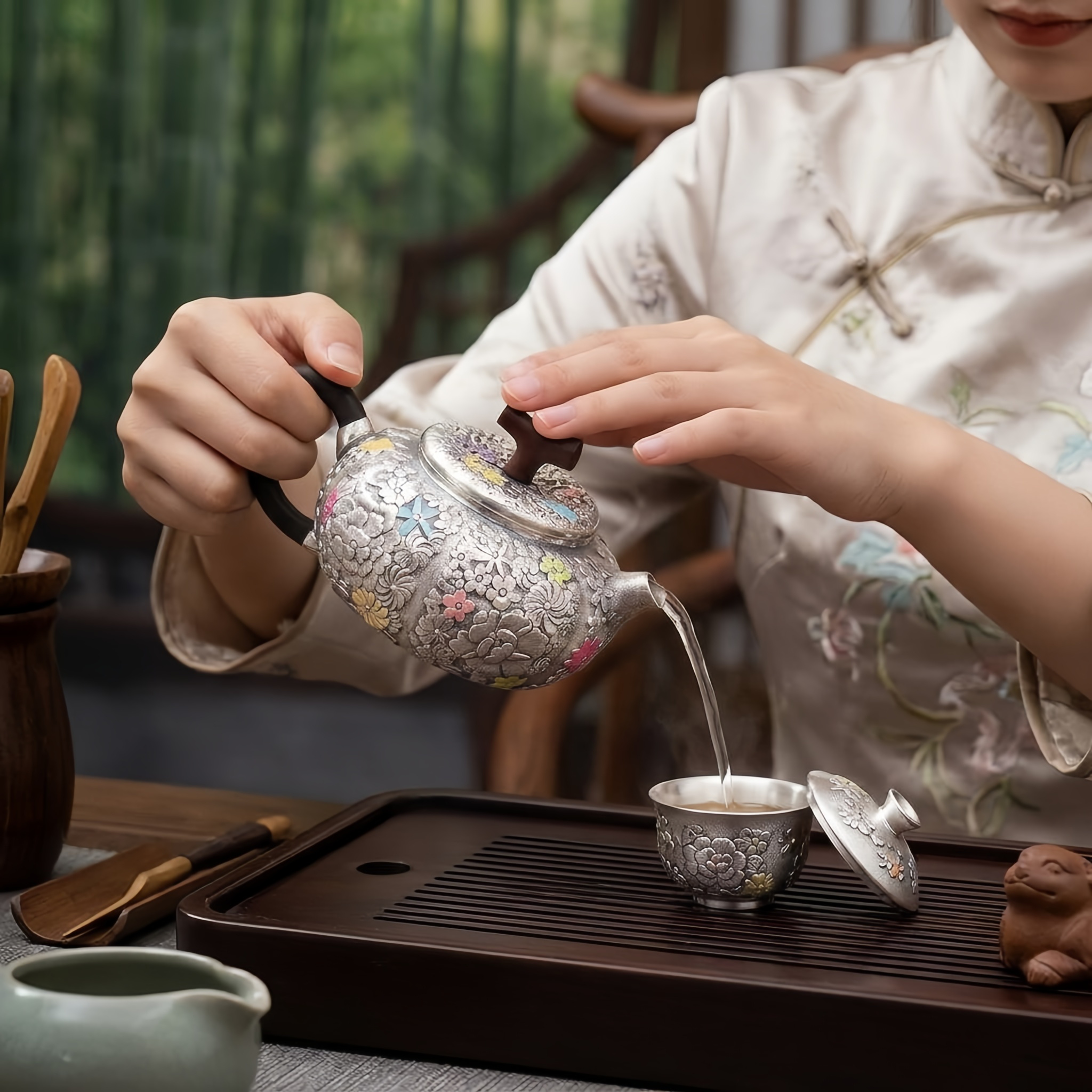 925 Sterling Silver Handcrafted Silver Floral Teapot with Multi-Colored Accents and Dark Wood Handle - Handicraft