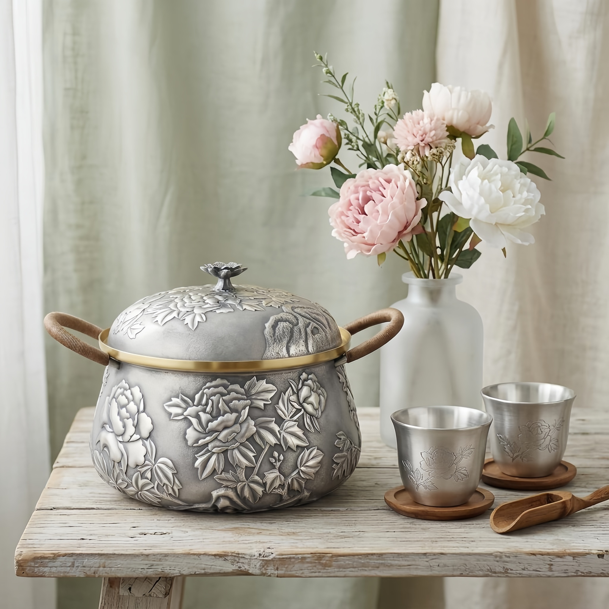 925 Sterling Silver Ornate Hand-Carved Silver Peony Floral Relief Pot with Artisan Rope Handles - Handicraft