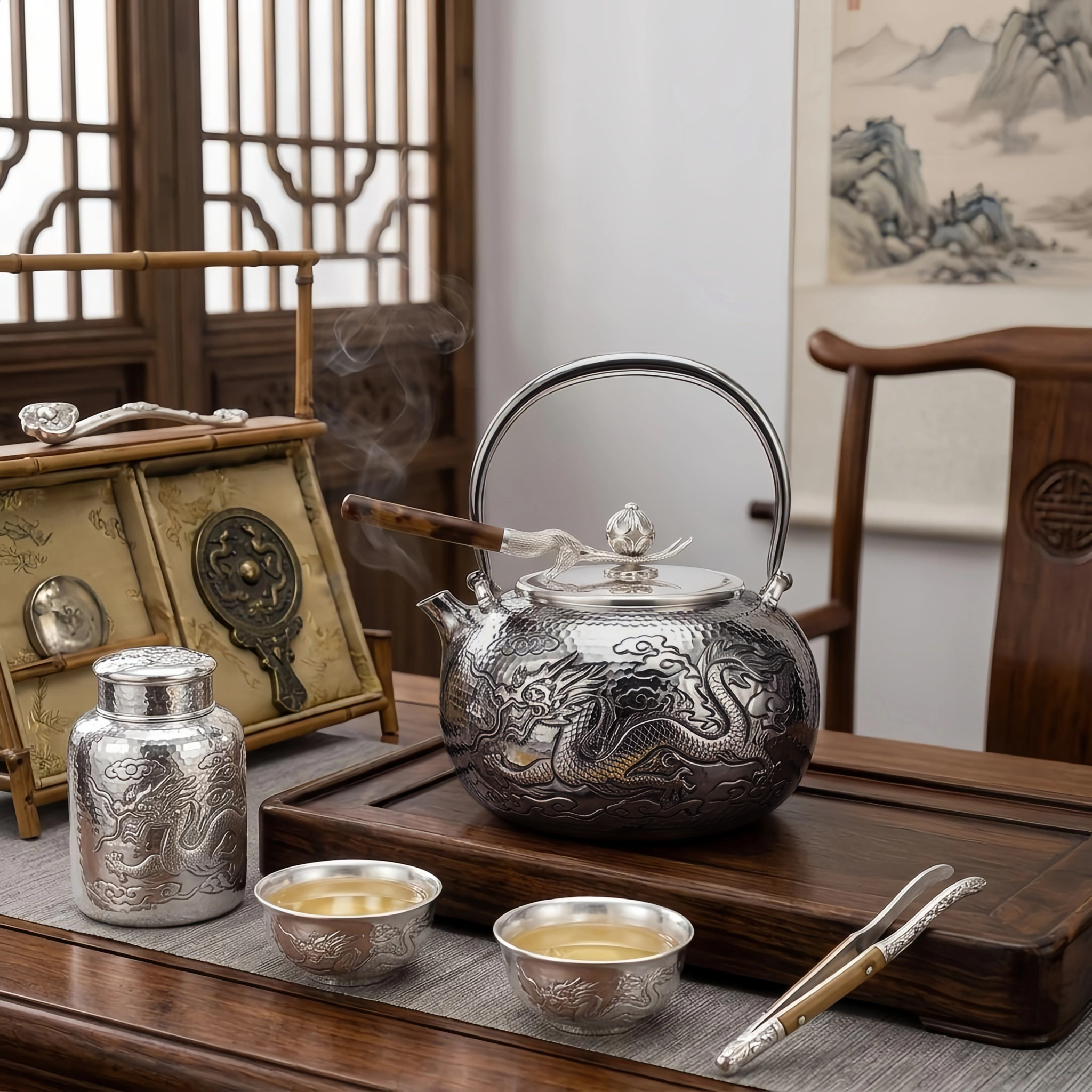 925 Sterling Silver Handcrafted Silver Dragon Kettle with Hammered Texture and Elegant Wooden Handle - Handicraft