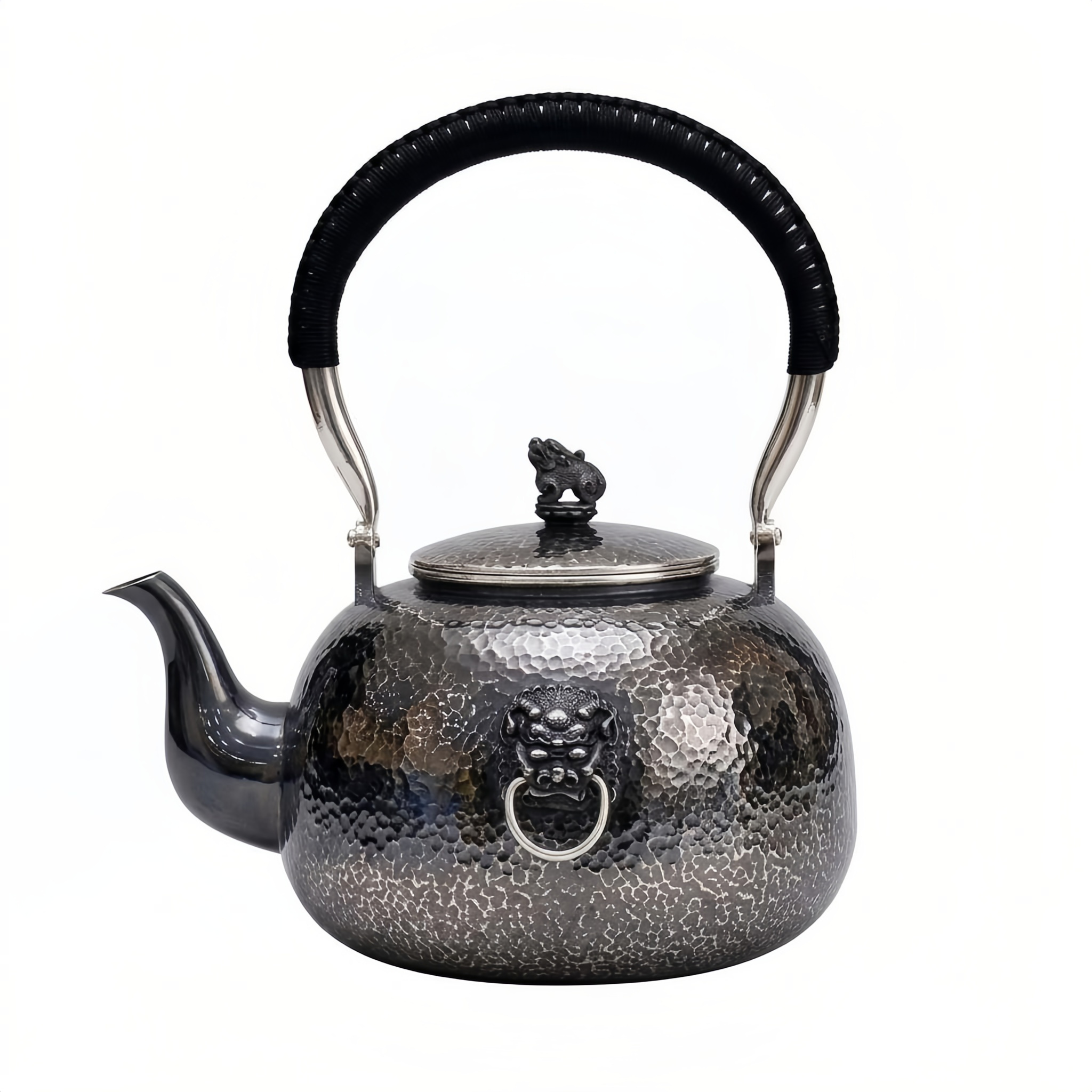 925 Sterling Silver Handcrafted Hammered Metal Teapot with Mythical Lion Head Decoration and Woven Handle - Handicraft