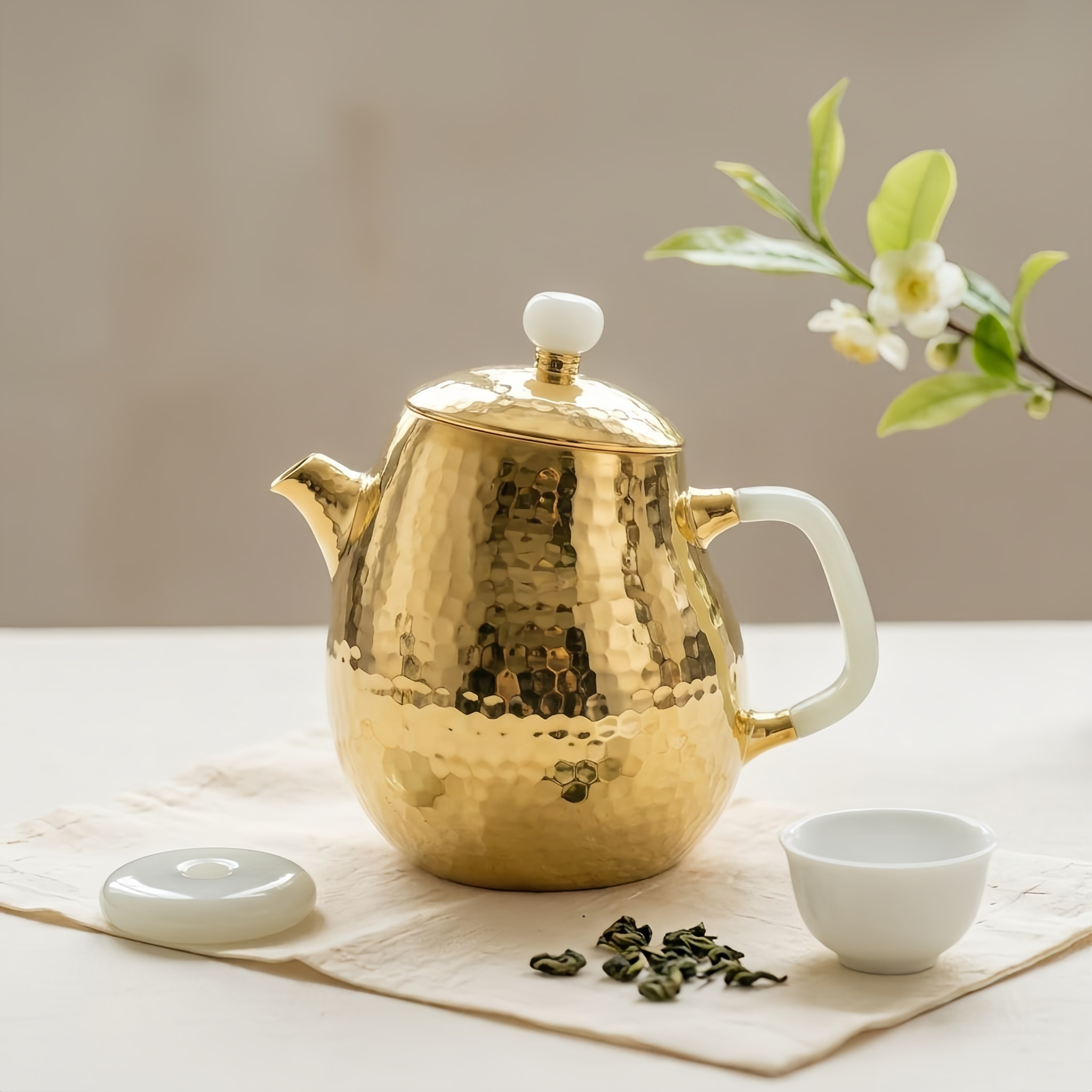 925 Sterling Silver Hammered Gilded Teapot with Elegant Milky White Handle and Finial - Handicraft