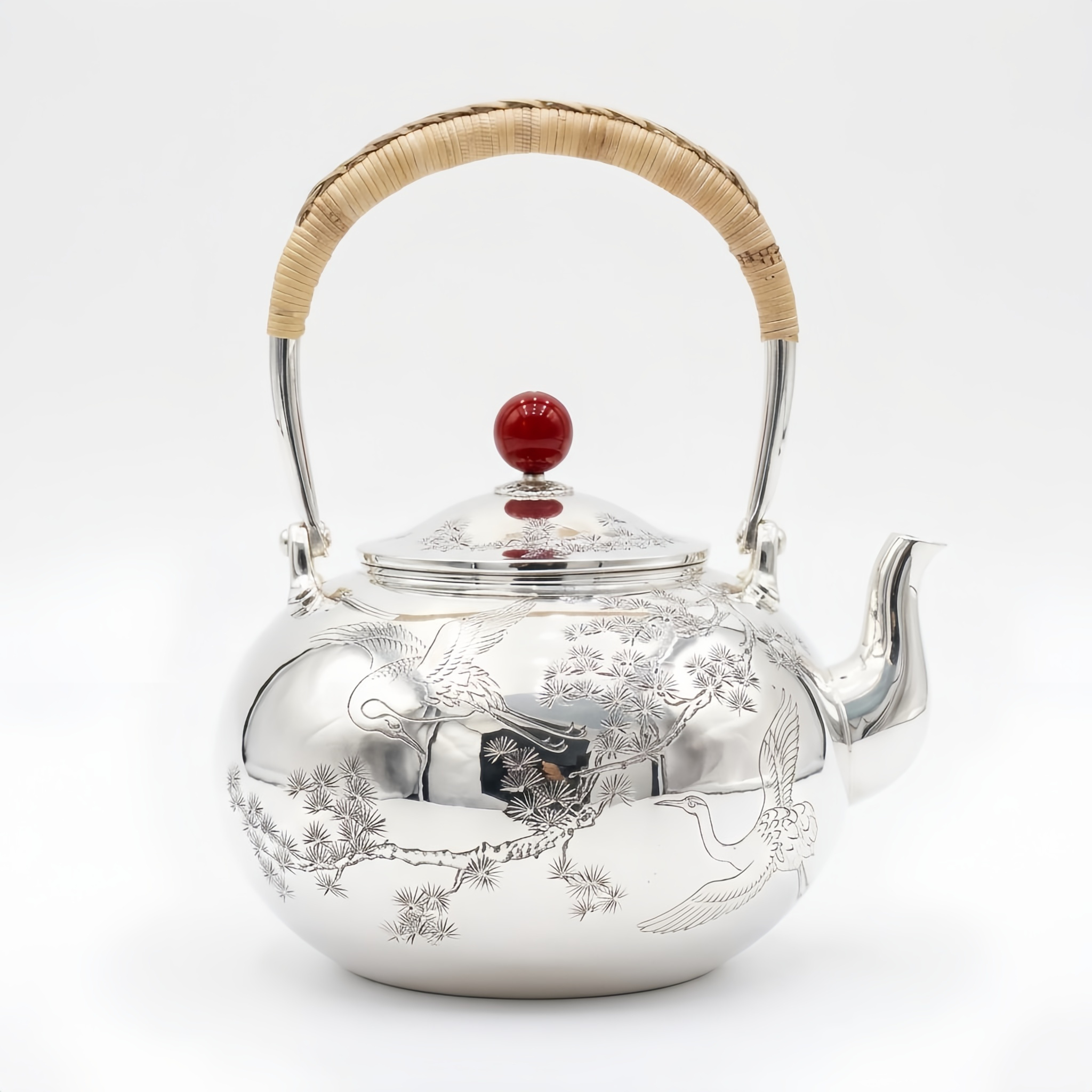 925 Sterling Silver Elegant Silver Tea Kettle Featuring Crane Engravings and Woven Bamboo Handle - Handicraft