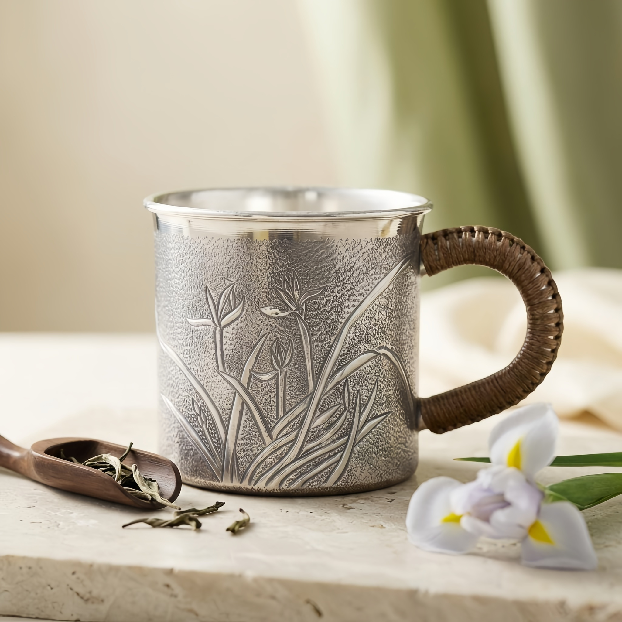 925 Sterling Silver Handcrafted Silver-Toned Floral Mug with Woven Rattan Handle - Handicraft