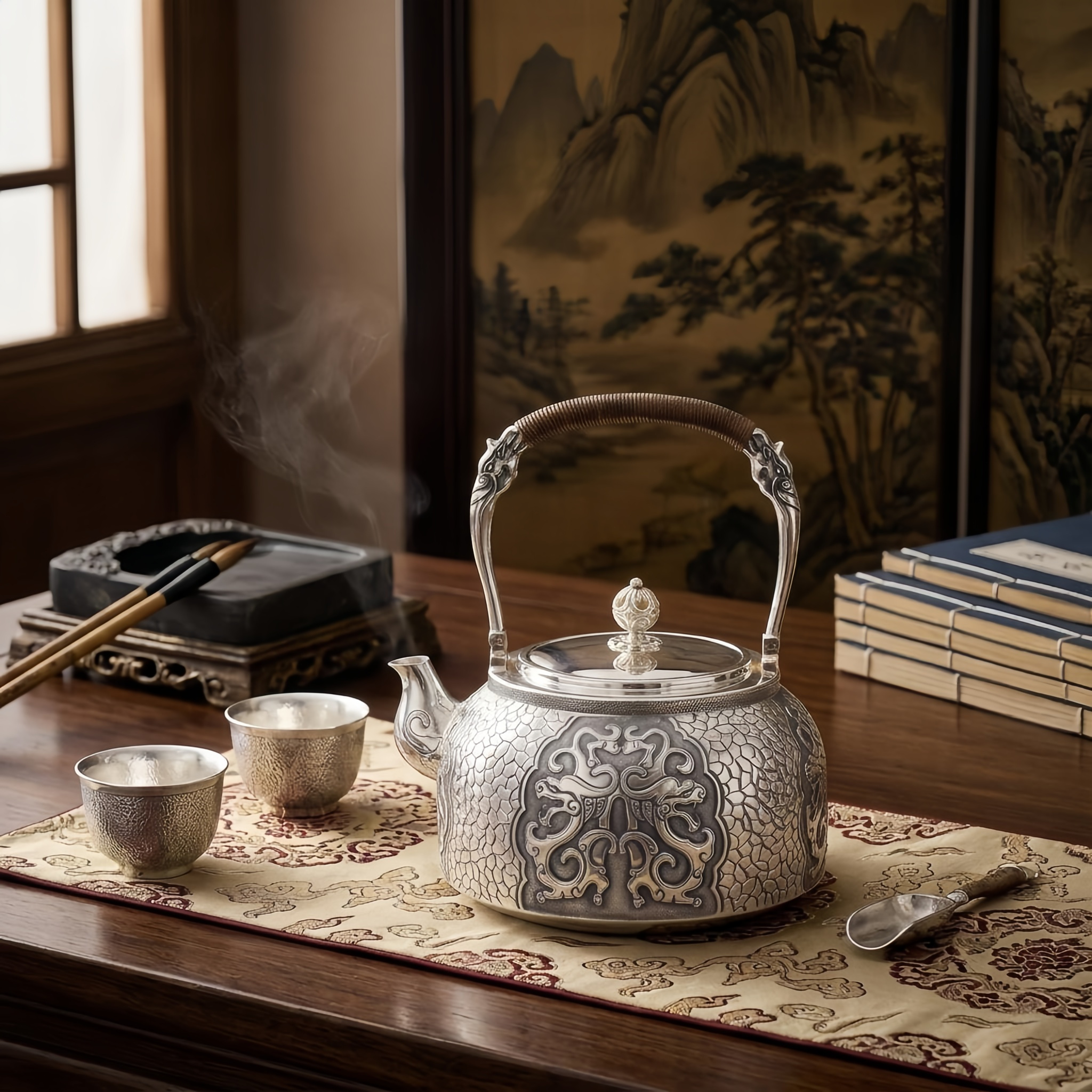 925 Sterling Silver Exquisite Handcrafted Silver Teapot Featuring Intricate Dragon Motifs and Woven Handle - Handicraft
