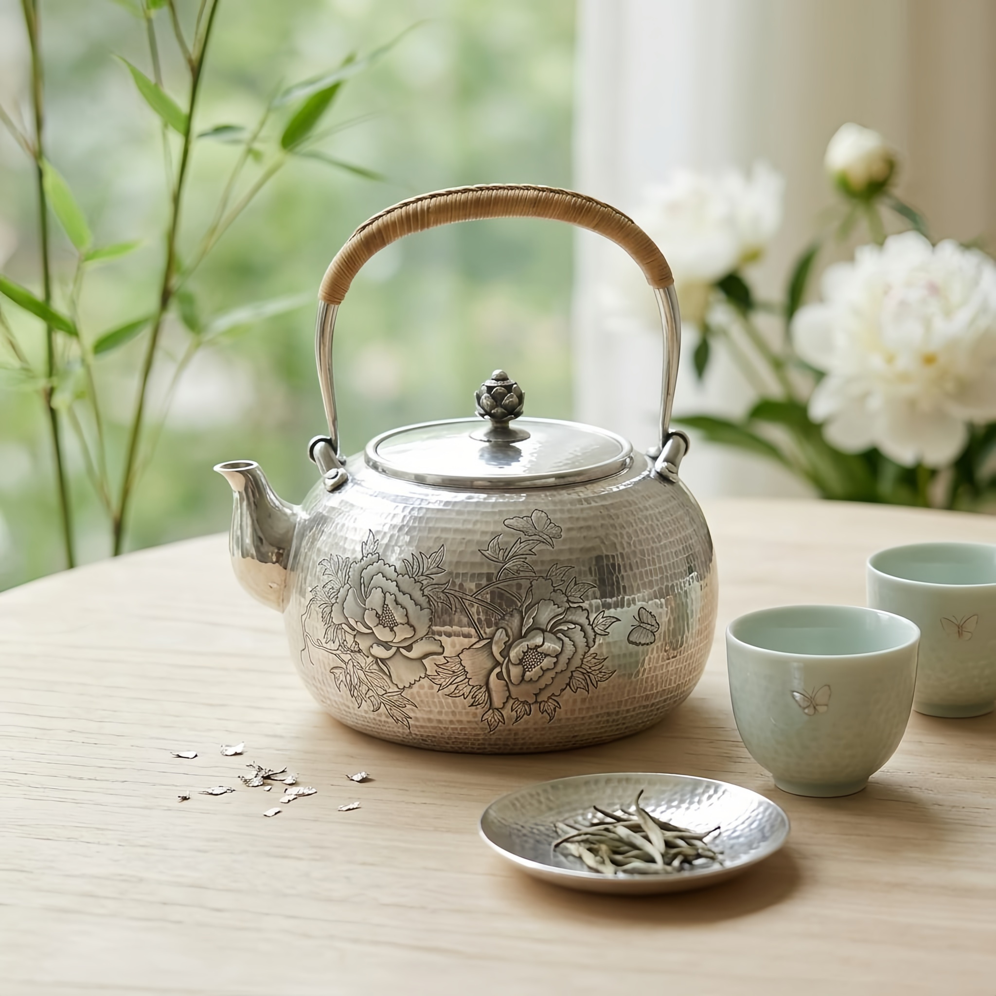925 Sterling Silver Handcrafted Hammered Silver Teapot with Intricate Peony Engravings and Wicker-Wrapped Handle - Handicraft