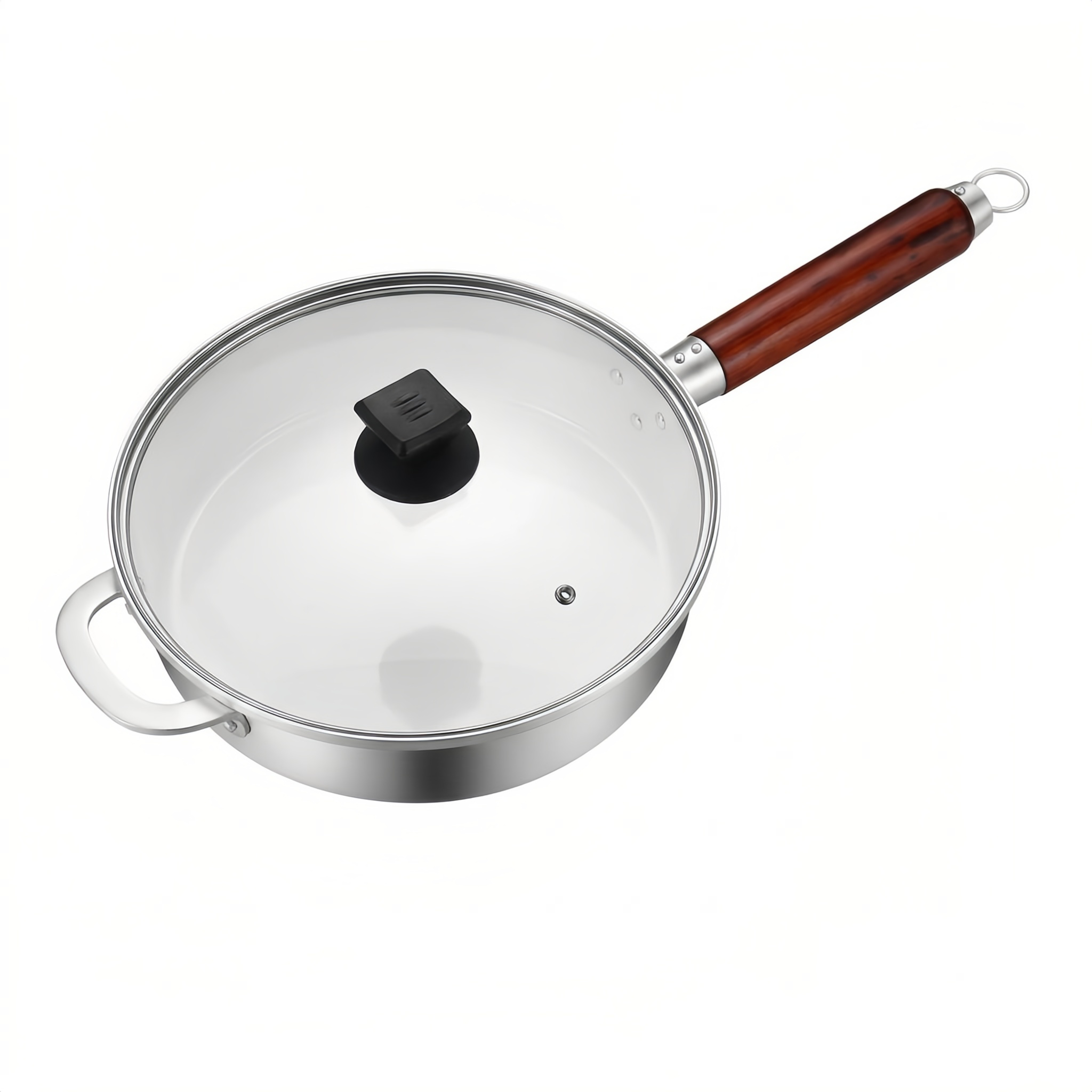 925 Sterling Silver Stainless Steel Sauté Pan with Tempered Glass Lid and Ergonomic Wooden Handle - Handicraft