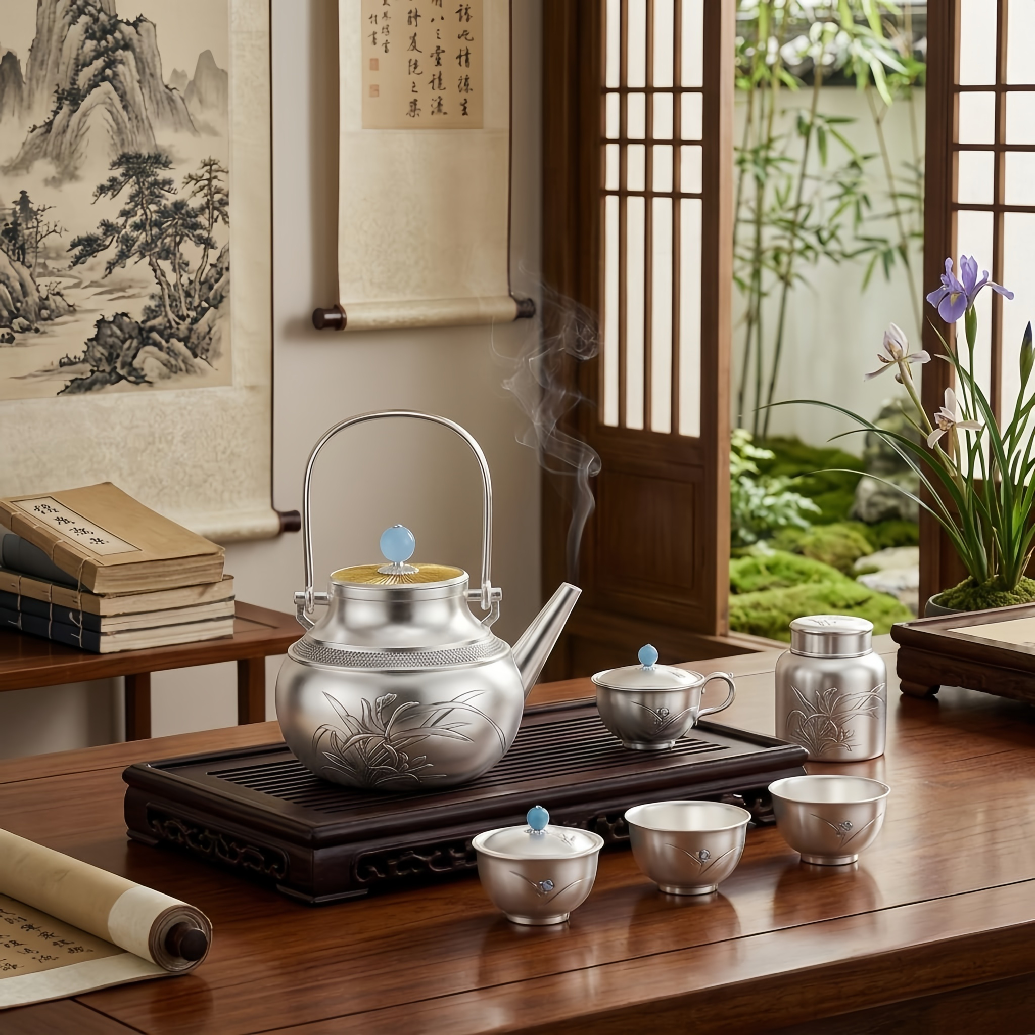 925 Sterling Silver Elegant Silver Teapot with Floral Engravings and a Polished Blue Finial - Handicraft