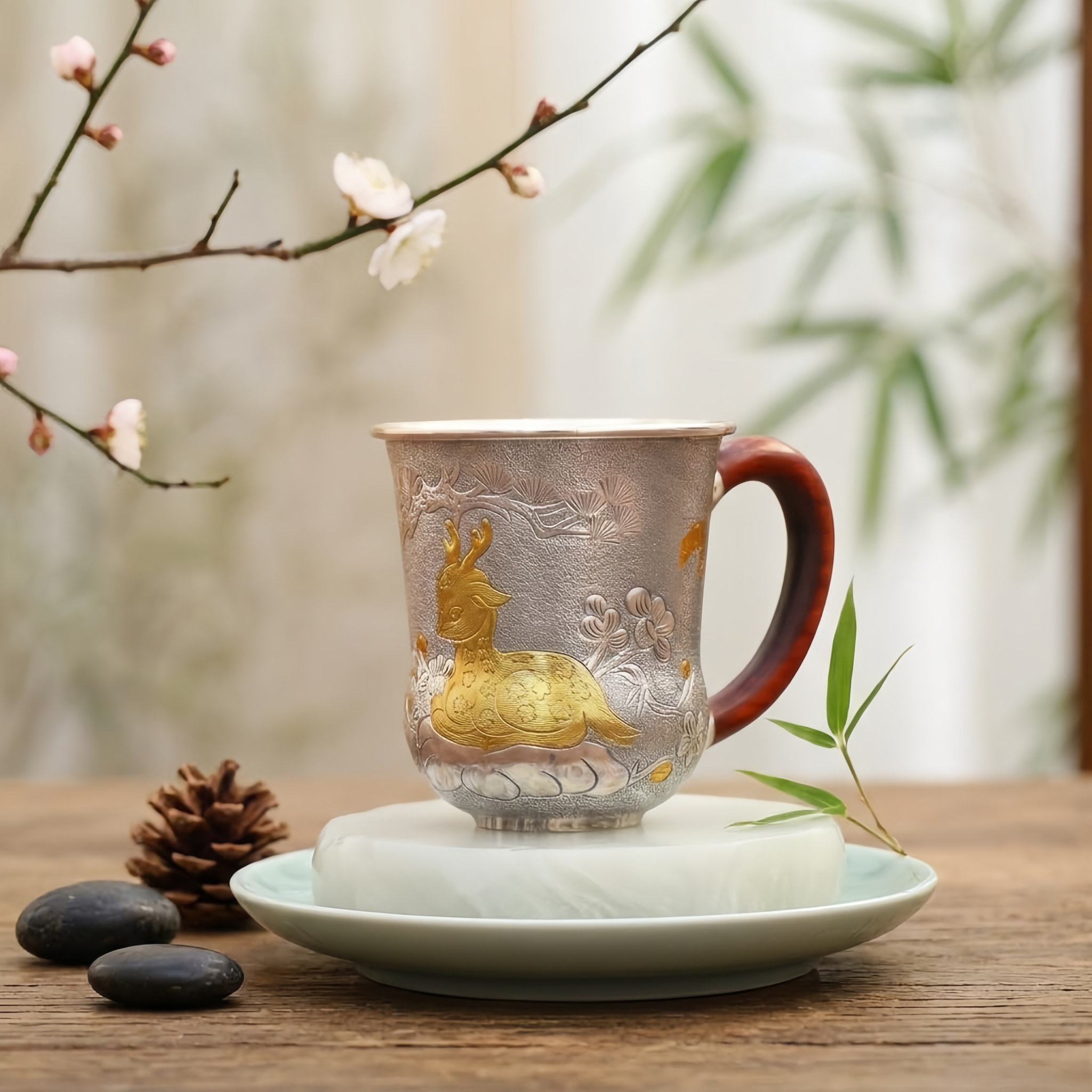 925 Sterling Silver Handcrafted Silver Cup with Intricate Deer Engraving and Polished Wood Handle - Handicraft