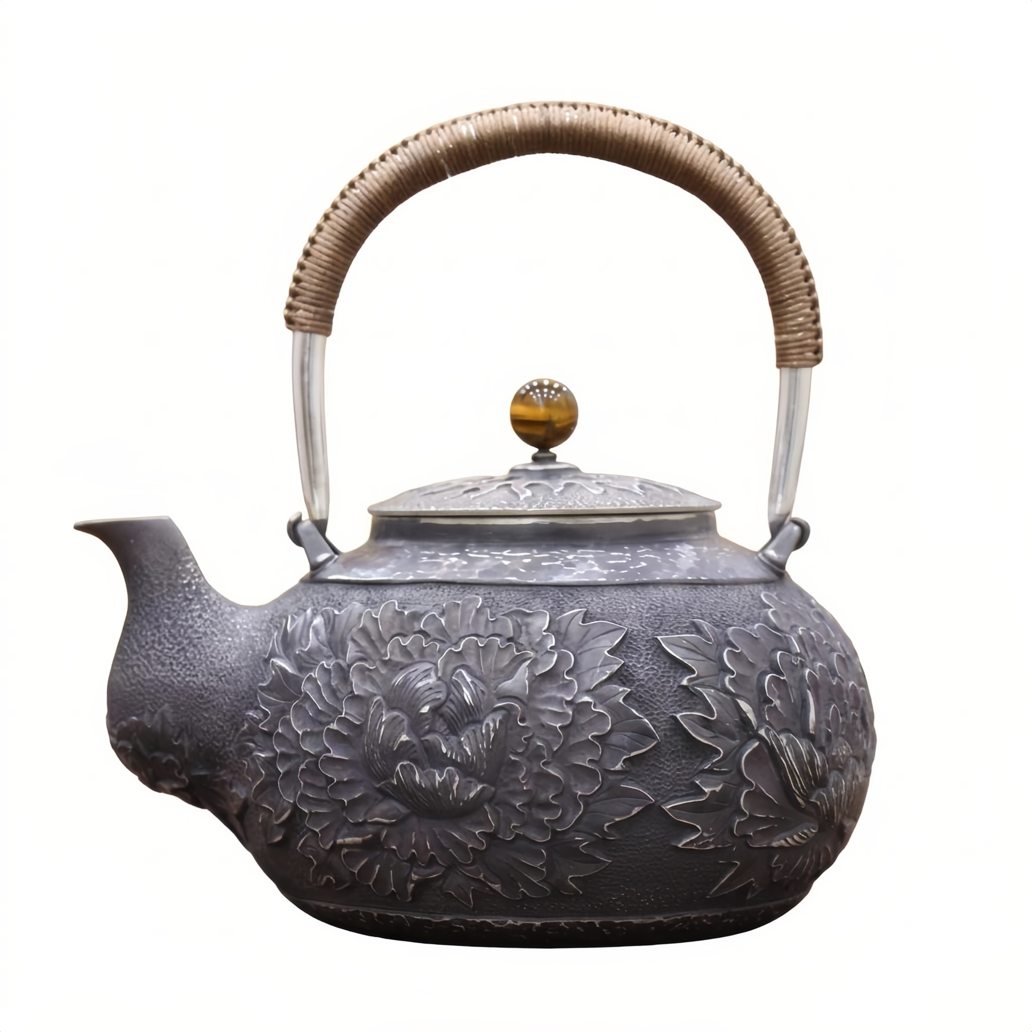 925 Sterling Silver Hand-Carved Silver Peony Teapot with Rattan Handle and Tiger Eye Finial - Handicraft
