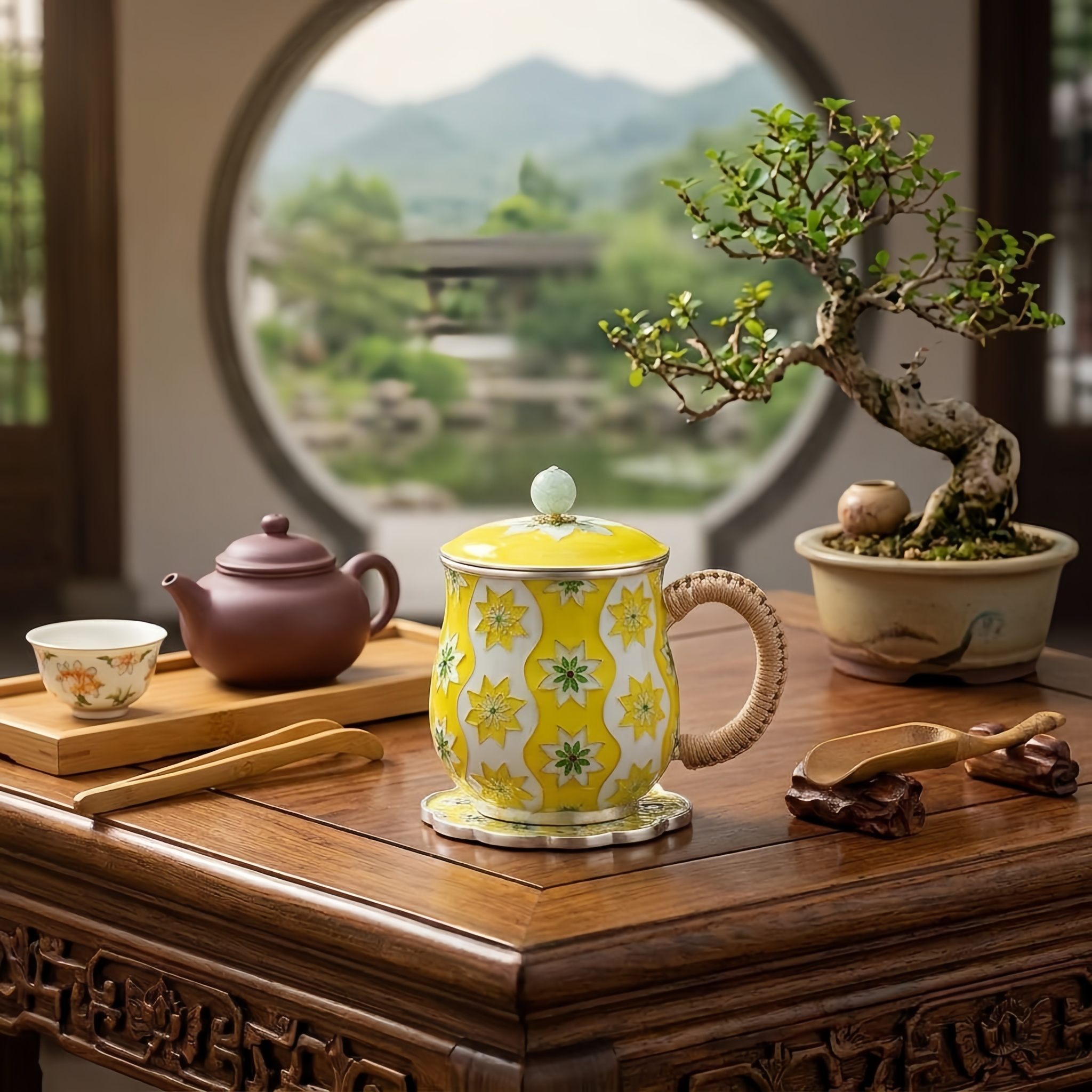 925 Sterling Silver Elegant Floral Enamel Tea Mug with Woven Handle and Jade Inlay Lid - Handicraft