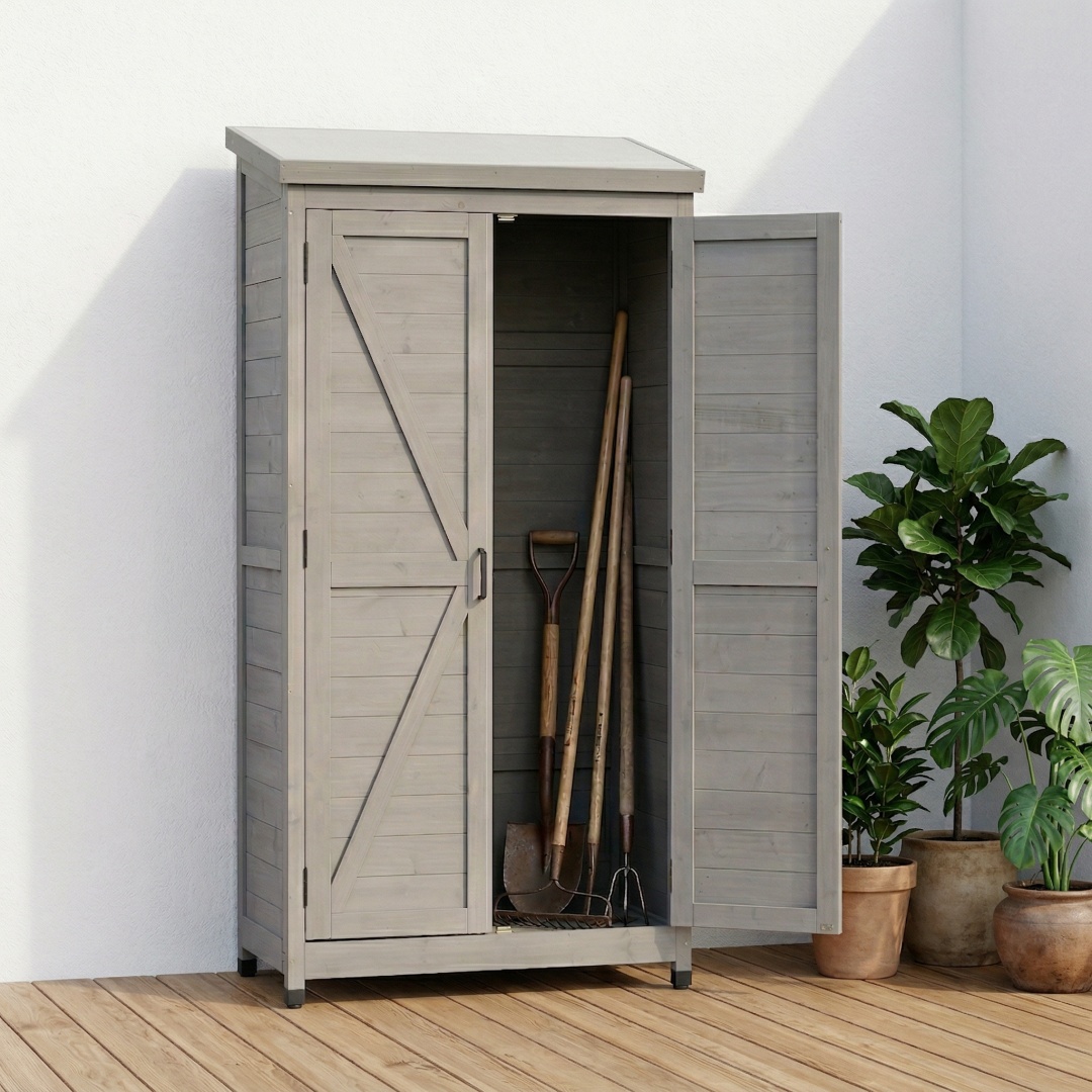 Outdoor Wooden Storage Shed With Metal Top Tall Vertical Tool Cabinet For Garden Patio Lawn