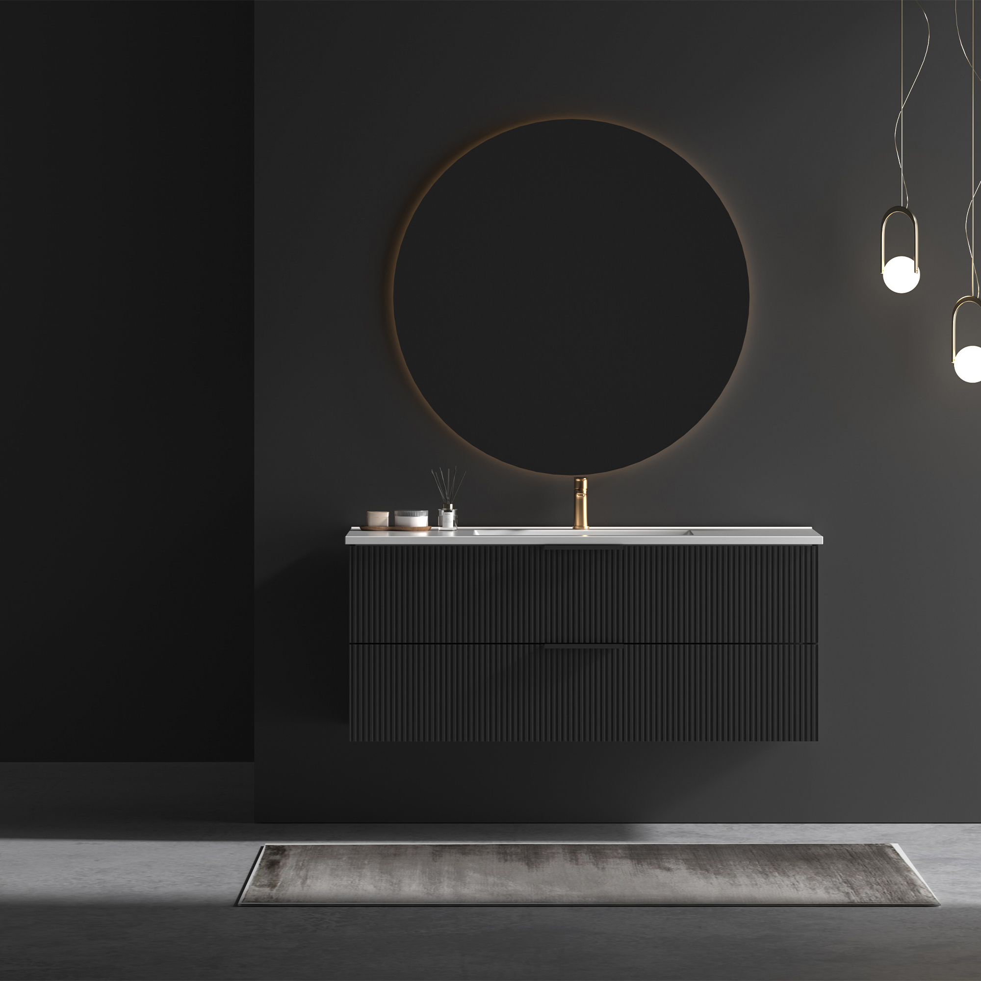 48 Inch Bathroom Vanity Cabinet With Ceramic Sink - Black Wall Mounted Floating Fluted Vanity With Drawers Modern