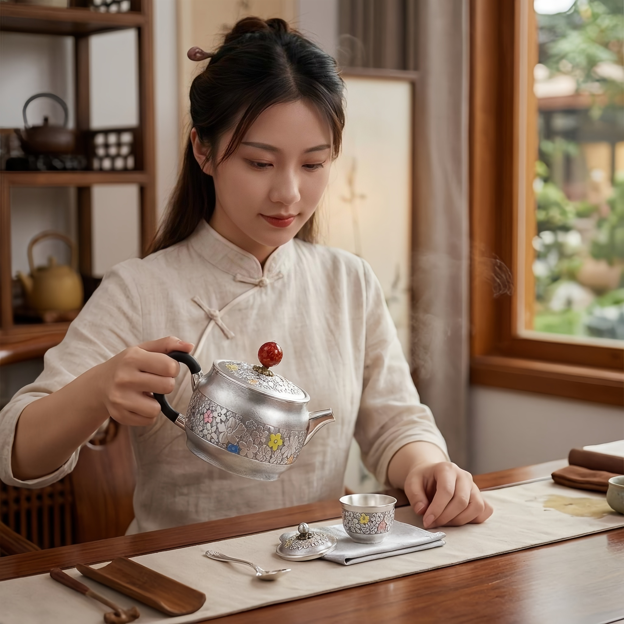 925 Sterling Silver Handcrafted Engraved Silver Floral Teapot Featuring a Decorative Red Knob and Enamel Accents - Handicraft