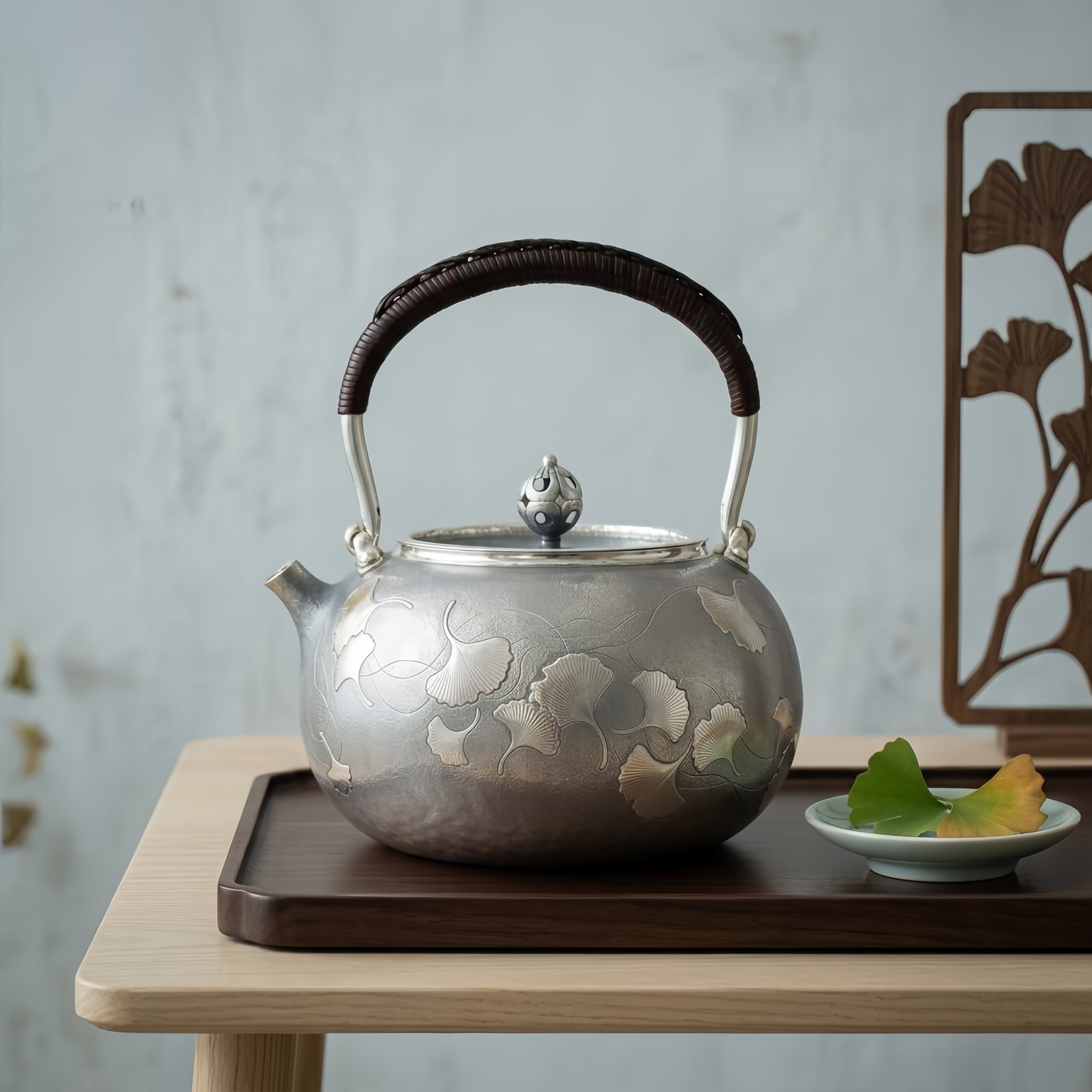 925 Sterling Silver Handcrafted Silver Teapot with Ginkgo Leaf Engravings and a Traditional Woven Handle - Handicraft