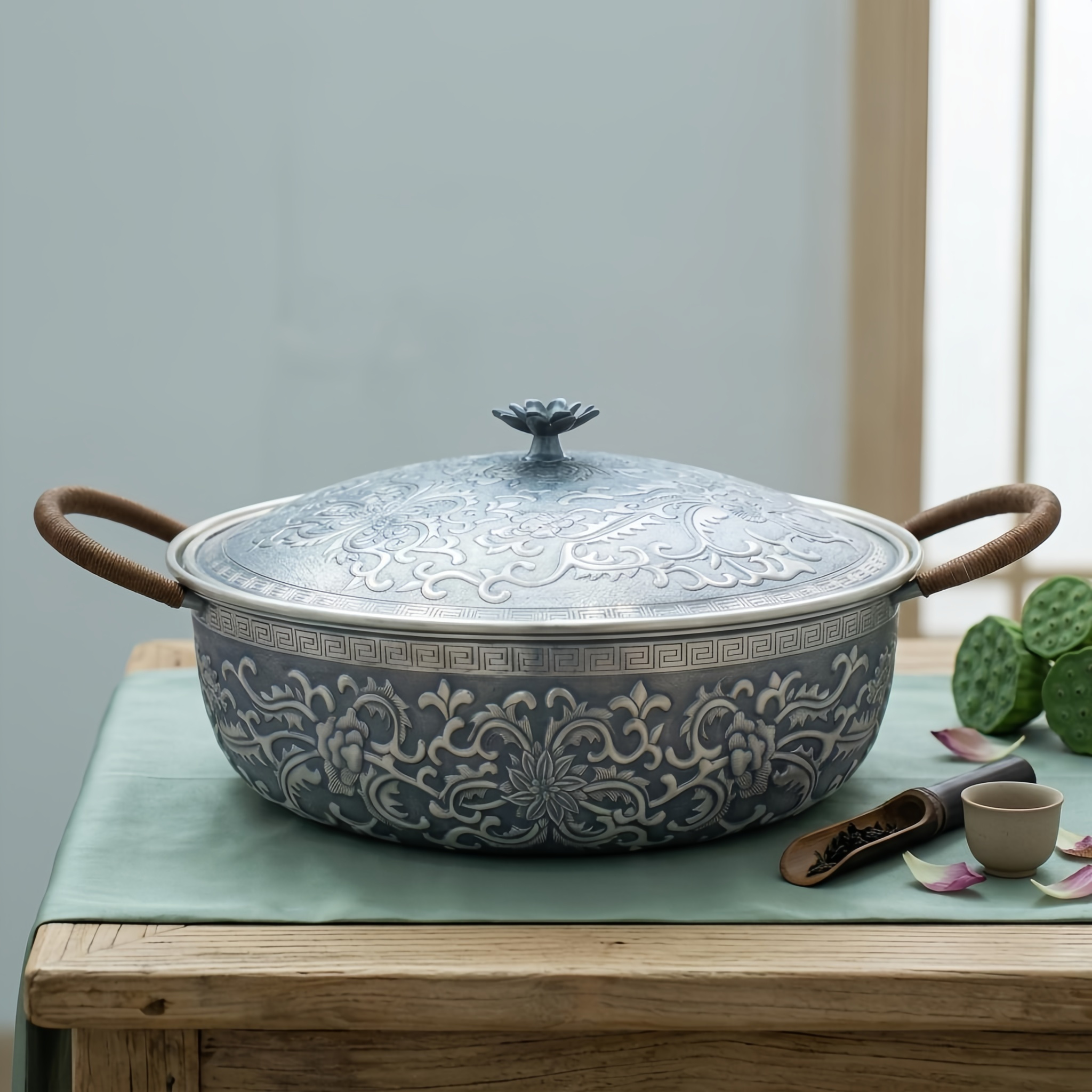 925 Sterling Silver Exquisite Handcrafted Silver-Tone Embossed Floral Serving Pot with Woven Handles and Decorative Lid - Handicraft
