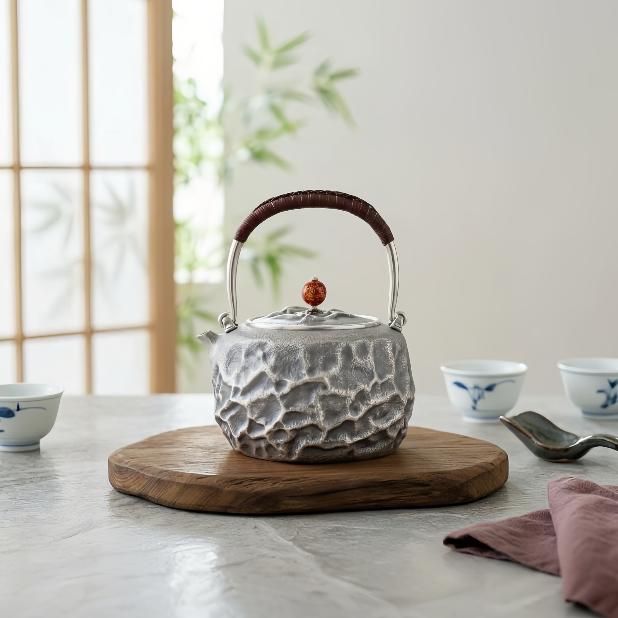 925 Sterling Silver Artistic Gray Teapot with Cracked Earth Texture and Contrasting Metallic Handle-Fine large teapot - Handicraft