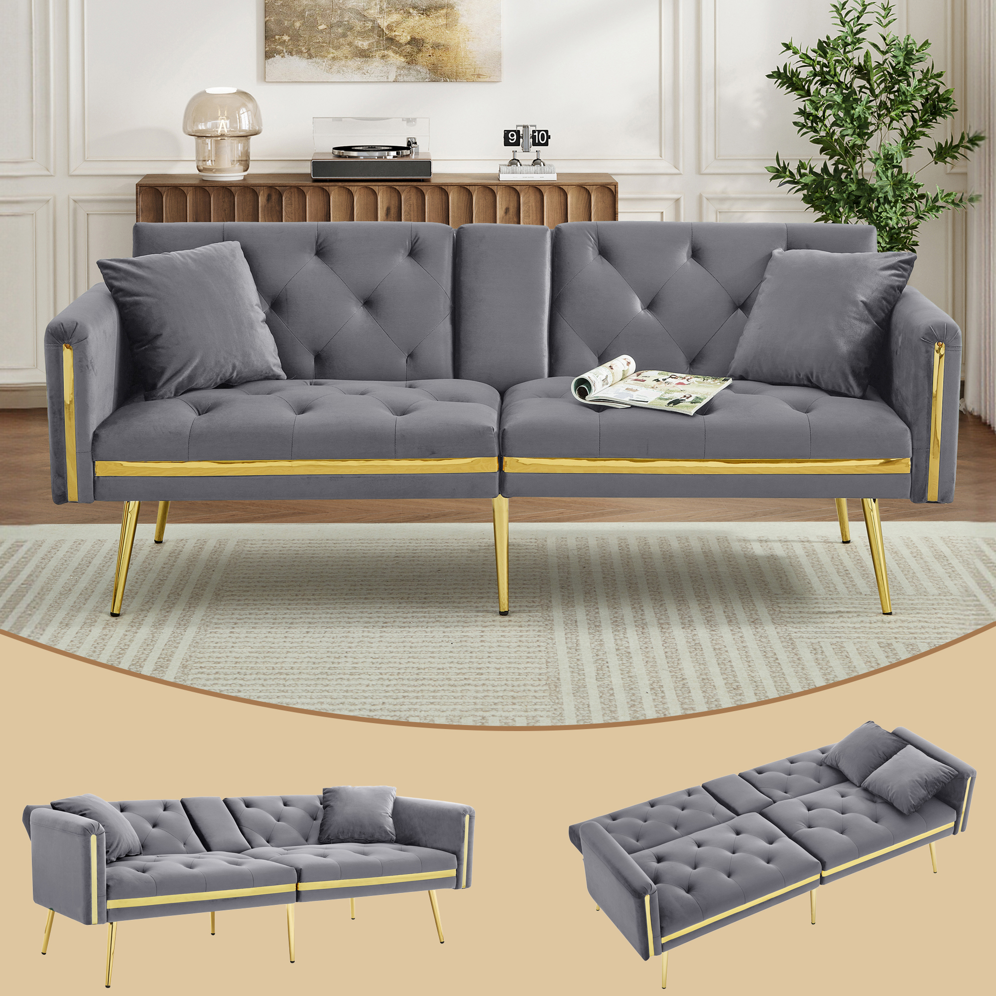 Two-seater Sofa Bed With Adjustable Backrest, Gold Accents And Built-in Cup Holders - Convertible Into A Comfortable And Space-saving Two-seater Sofa For Both The Living Room And Bedroom