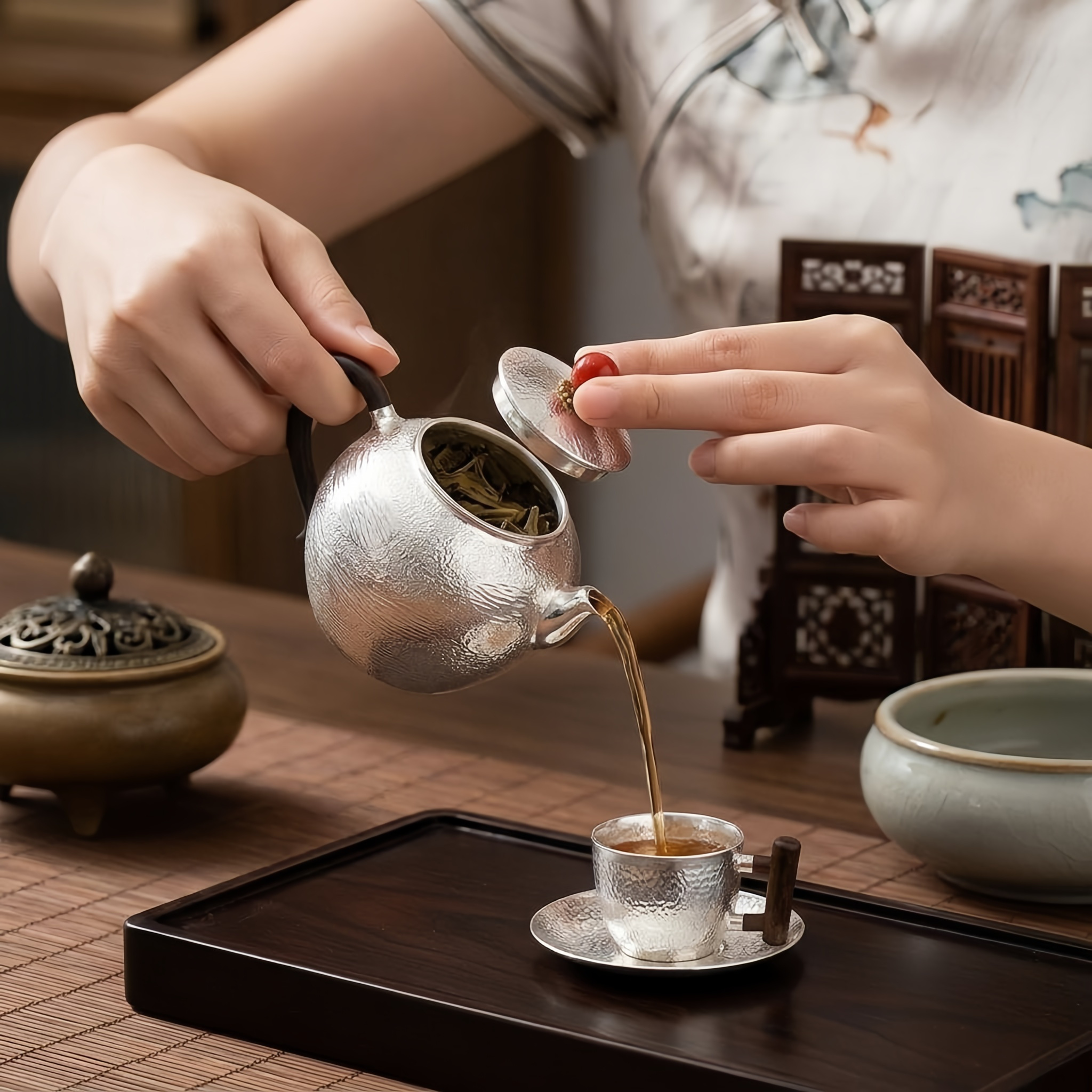 925 Sterling Silver Elegant Hammered Teapot with Wooden Handle and Ruby Knob-exquisite handmade teapot - Handicraft